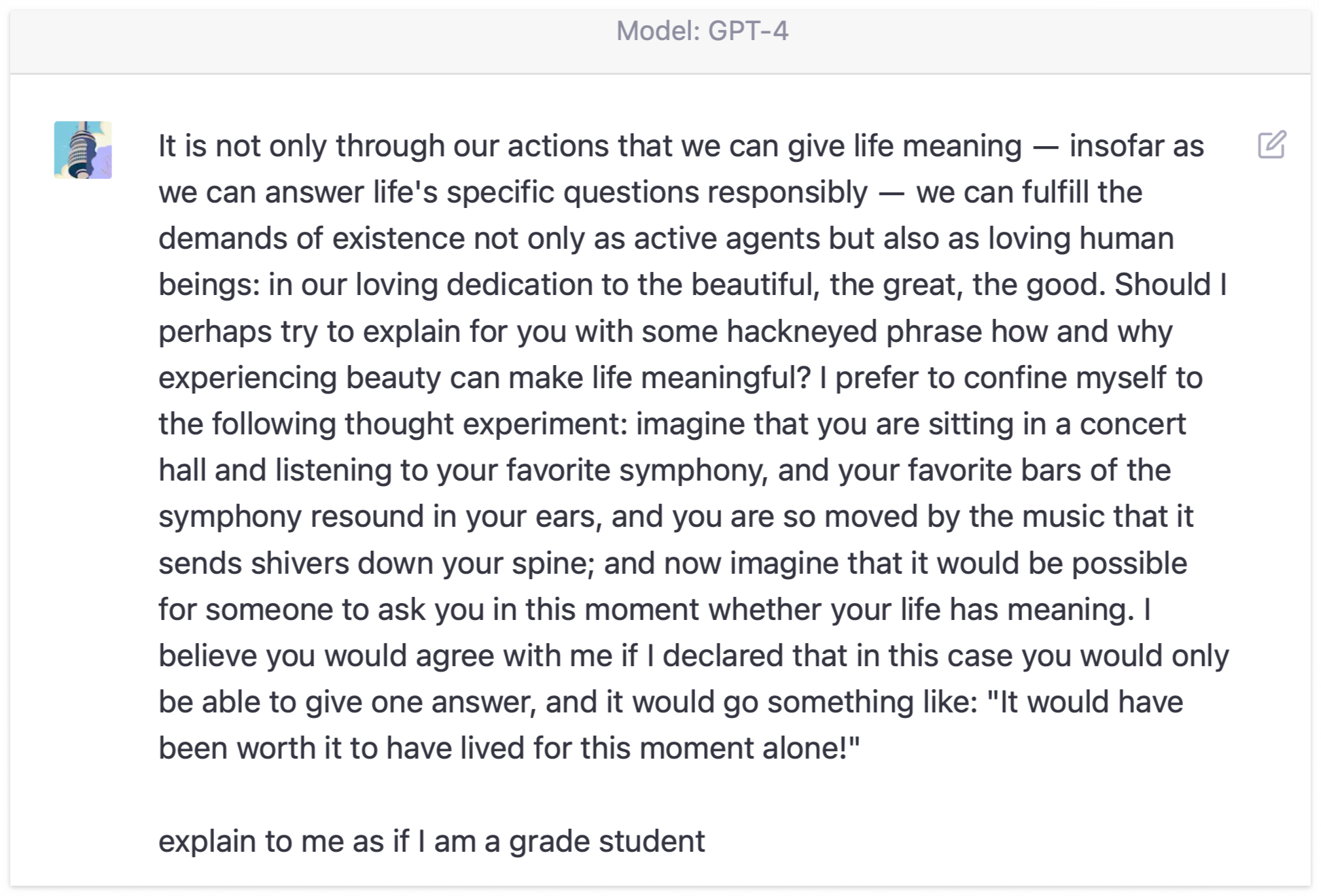 But we can also find meaning in life by being loving human beings, appreciating beauty, and embracing the goodness around us. This means that we can find joy and purpose in the simple moments, like enjoying a beautiful piece of art, admiring a stunning landscape, or connecting deeply with another person.