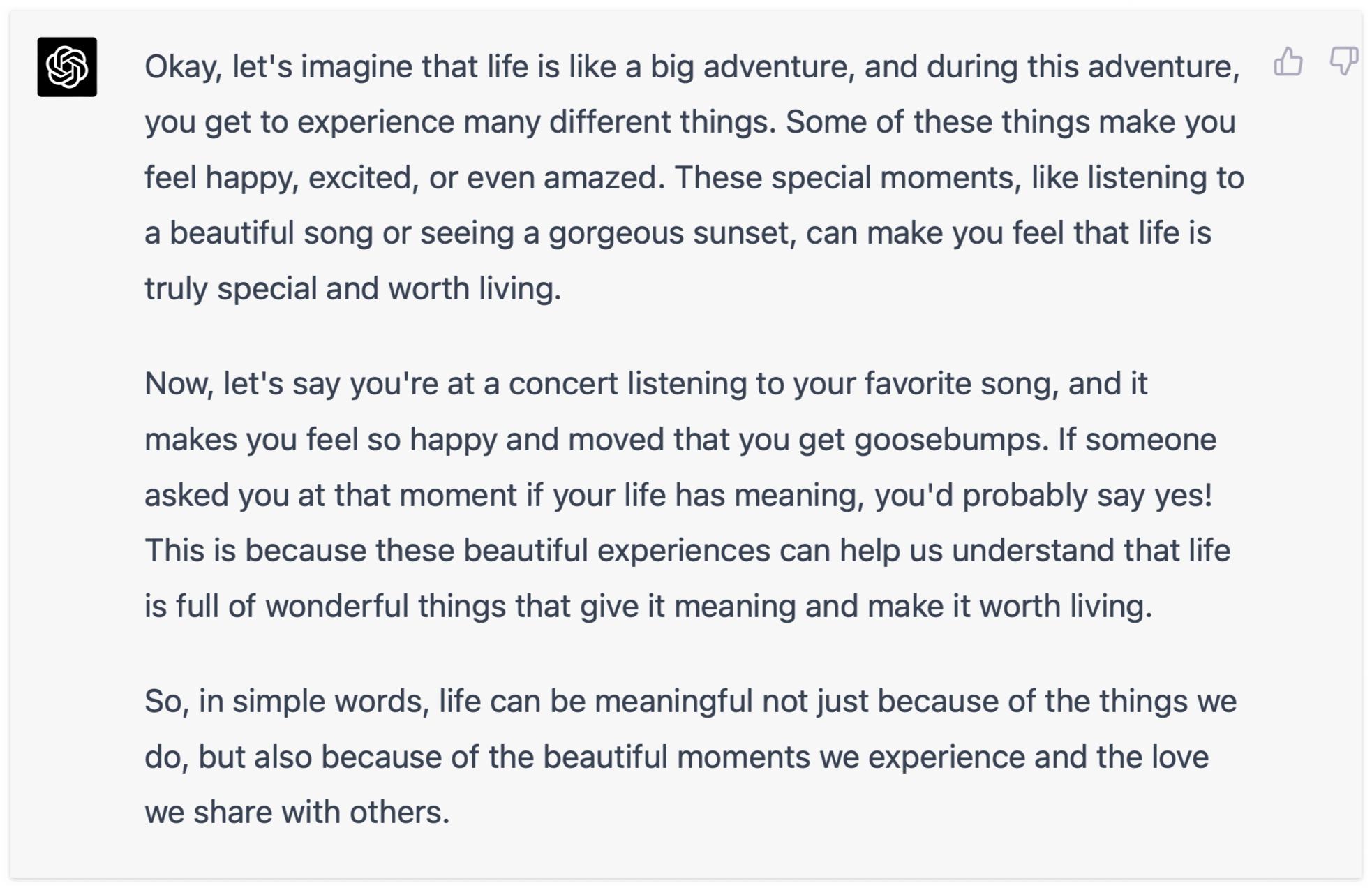 Now, let's say you're at a concert listening to your favorite song, and it makes you feel so happy and moved that you get goosebumps. If someone asked you at that moment if your life has meaning, you'd probably say yes! This is because these beautiful experiences can help us understand that life is full of wonderful things that give it meaning and make it worth living.