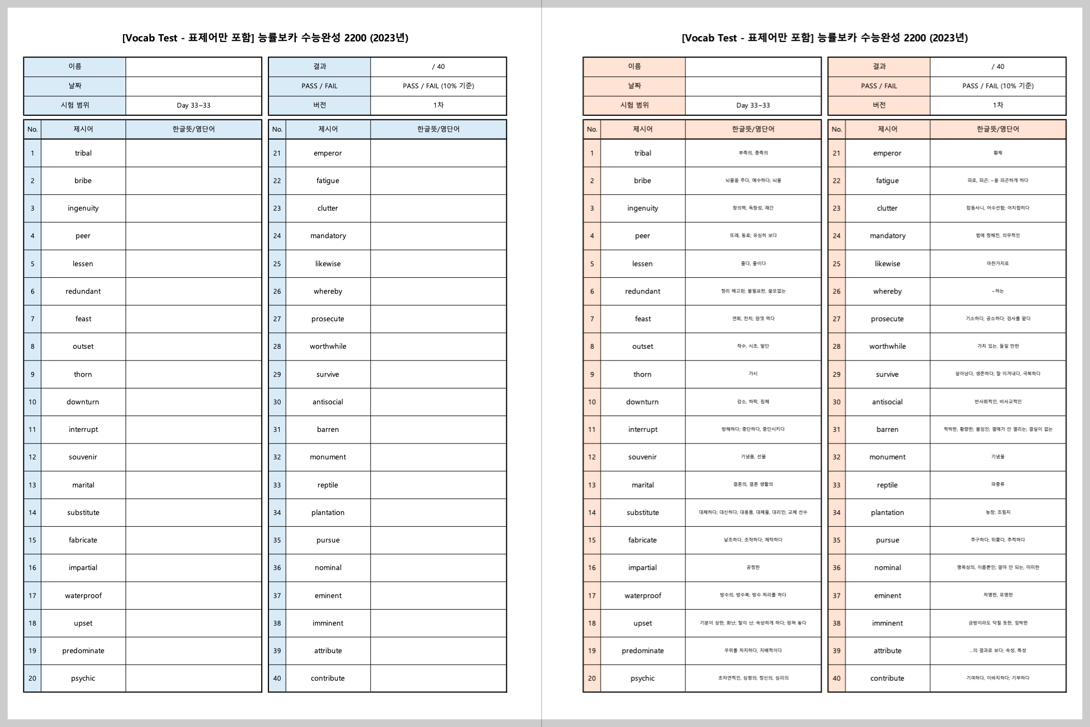 [무료 PDF] 능률VOCA 수능완성 2200 [2023 개정] - 어휘 시험지 및 답지 (1강 묶음, 파생어 포함)