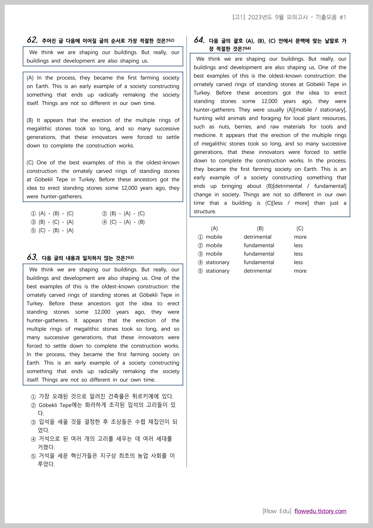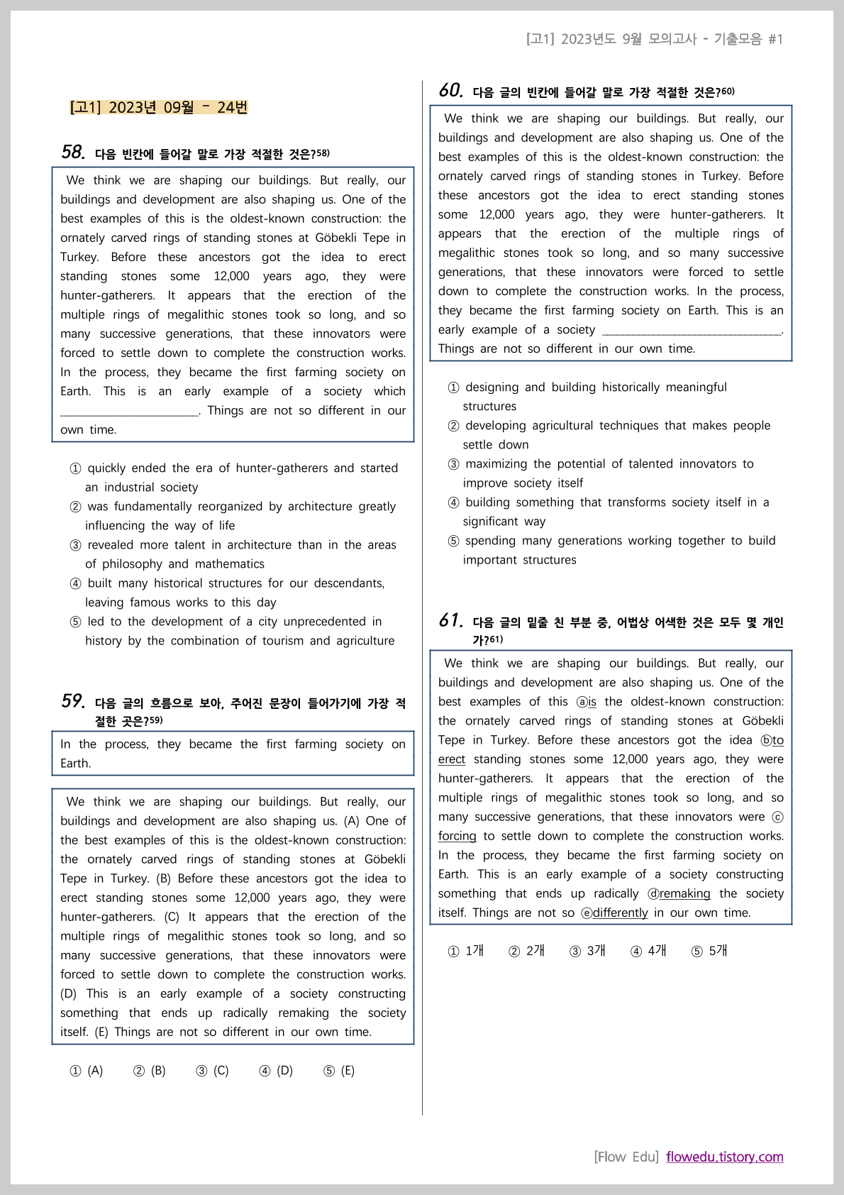안녕하세요, Flow 영어연구소입니다. 오늘은 고1 2023년도 9월 모의고사>의 기출문제 모음 2번째 자료를 올립니다.[고1] 2023년 9월 기출모음 #2 - 165문항과거 학교에서 출제됐던 기출 문제들을 문항