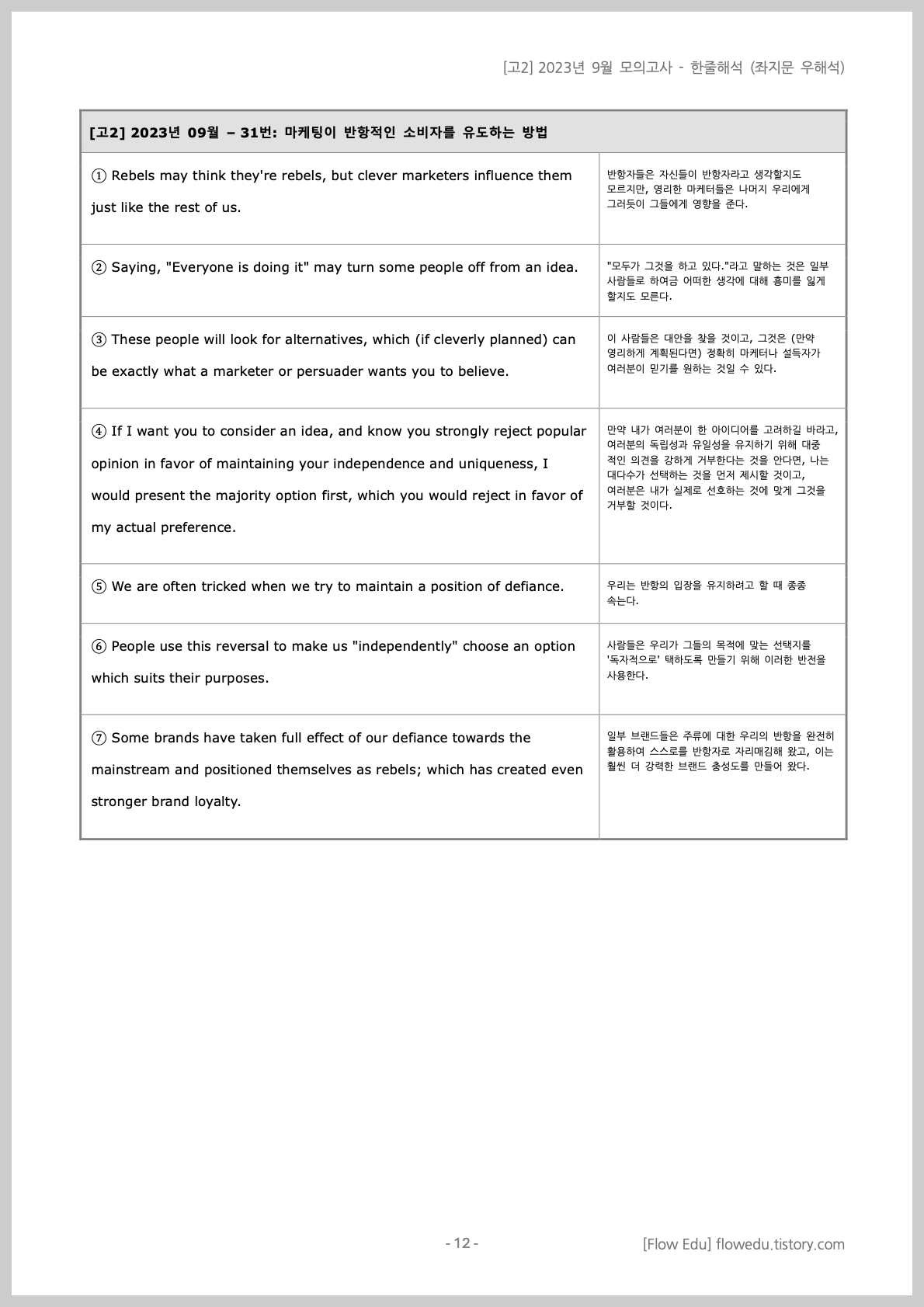 안녕하세요, Flow 영어연구소입니다. 오늘은 [고2] 2023년도 9월 영어 모의고사>의 한줄해석 자료 올립니다.설명문/실용문을 제외한 모든 지문을 포함했습니다. 자료는 PDF와 워드 파일 모