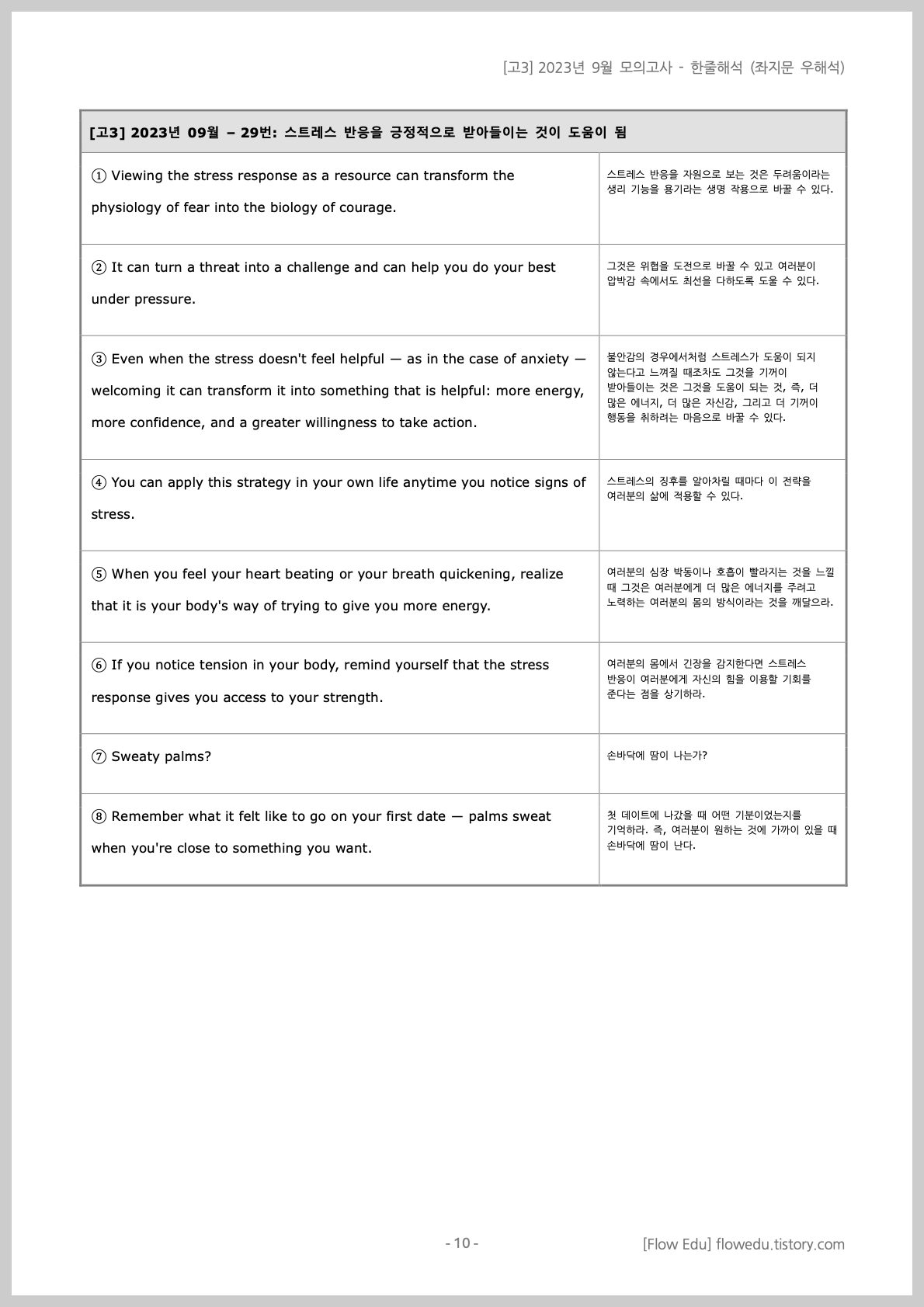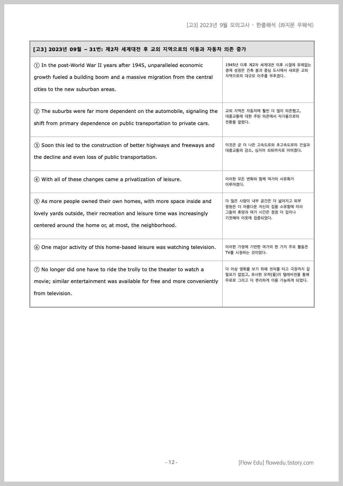 안녕하세요, Flow 영어연구소입니다. 오늘은 [고3] 2023년도 9월 영어 모의고사>의 한줄해석 자료 올립니다.설명문/실용문을 제외한 모든 지문을 포함했습니다. 자료는 PDF와 워드 파일 모