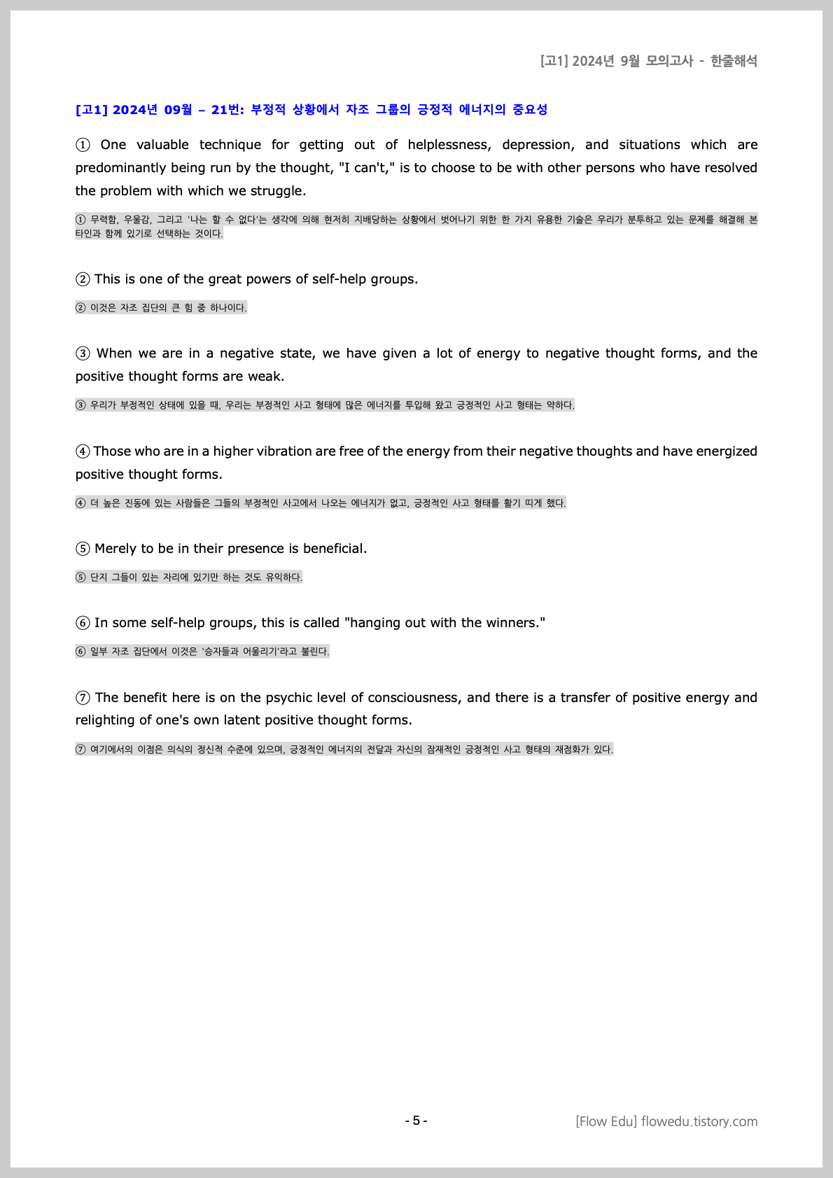 [고1] 2024년 09월 – 21번: 부정적 상황에서 자조 그룹의 긍정적 에너지의 중요성One valuable technique for getting out of helplessness, depression, and situations which are predominantly being run by the thought, "I can't,