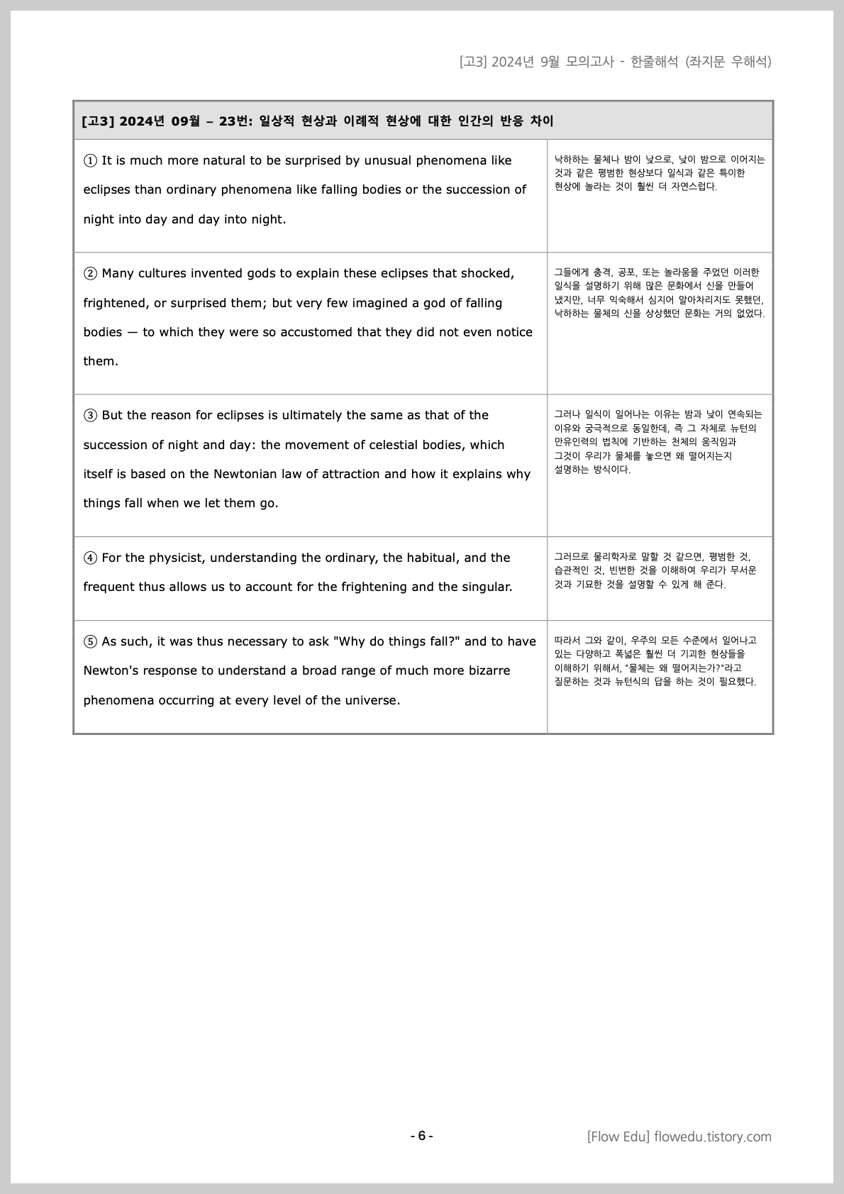 안녕하세요, Flow 영어연구소입니다. 2024년도 9월 고3 영어 모의고사>의 한줄해석 자료 올립니다.설명문/실용문을 제외한 모든 지문을 포함했습니다. 자료는 PDF와 워드 파일 모두 올립니