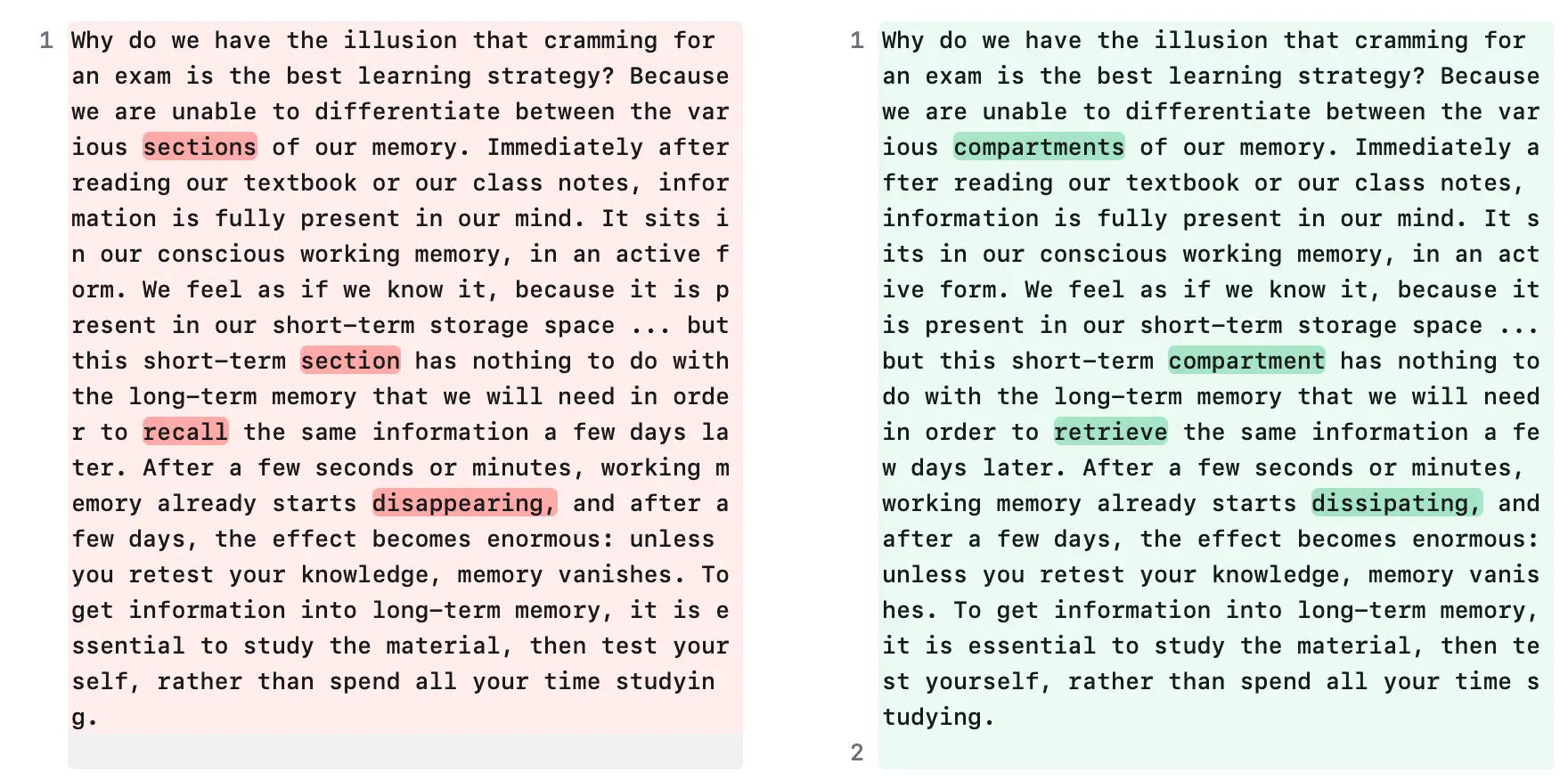 Why do we have the illusion that cramming for an exam is the best learning strategy? Because we are unable to differentiate between the various sections of our memory. Immediately after reading our textbook or our class notes, information is fully present in our mind. It sits in our conscious working memory, in an active form. We feel as if we know it, because it is present in our short-term storage space ... but this short-term section has nothing to do with the long-term memory that we will need in order to recall the same information a few days later. After a few seconds or minutes, working memory already starts disappearing, and after a few days, the effect becomes enormous: unless you retest your knowledge, memory vanishes. To get information into long-term memory, it is essential to study the material, then test yourself, rather than spend all your time studying.
