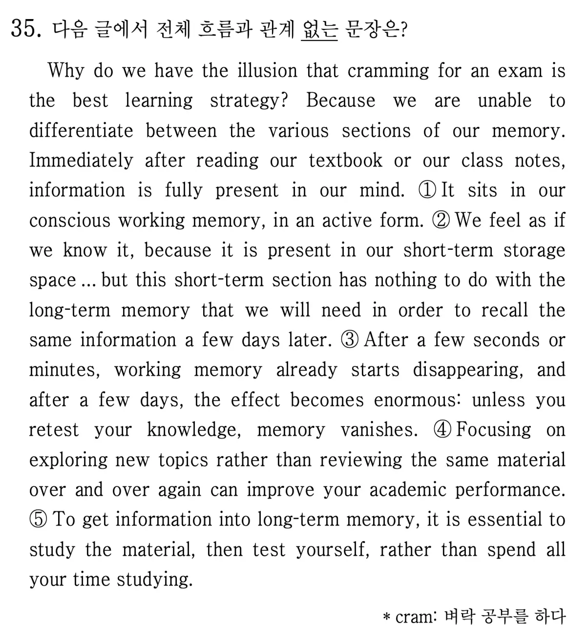 [고1] 2024년 09월 – 35번: 시험 준비에서 벼락치기가 효과적이지 않은 이유