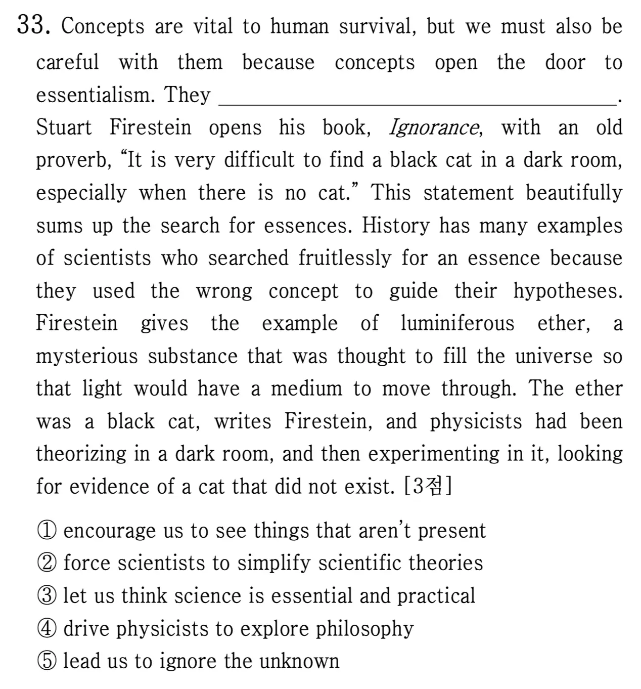 Concepts are vital to human survival, but we must also be careful with them because concepts open the door to essentialism. They encourage us to see things that aren't present. Stuart Firestein opens his book, Ignorance, with an old proverb, "It is very difficult to find a black cat in a dark room, especially when there is no cat." This statement beautifully sums up the search for essences. History has many examples of scientists who searched fruitlessly for an essence because they used the wrong concept to guide their hypotheses. Firestein gives the example of luminiferous ether, a mysterious substance that was thought to fill the universe so that light would have a medium to move through. The ether was a black cat, writes Firestein, and physicists had been theorizing in a dark room, and then experimenting in it, looking for evidence of a cat that did not exist.