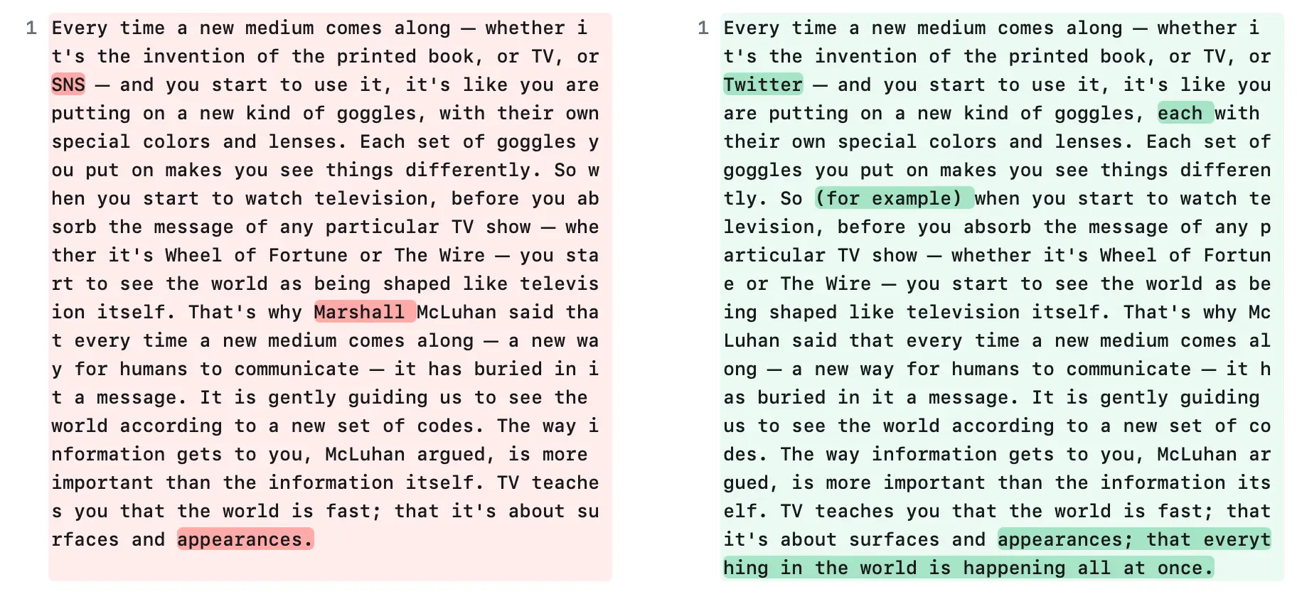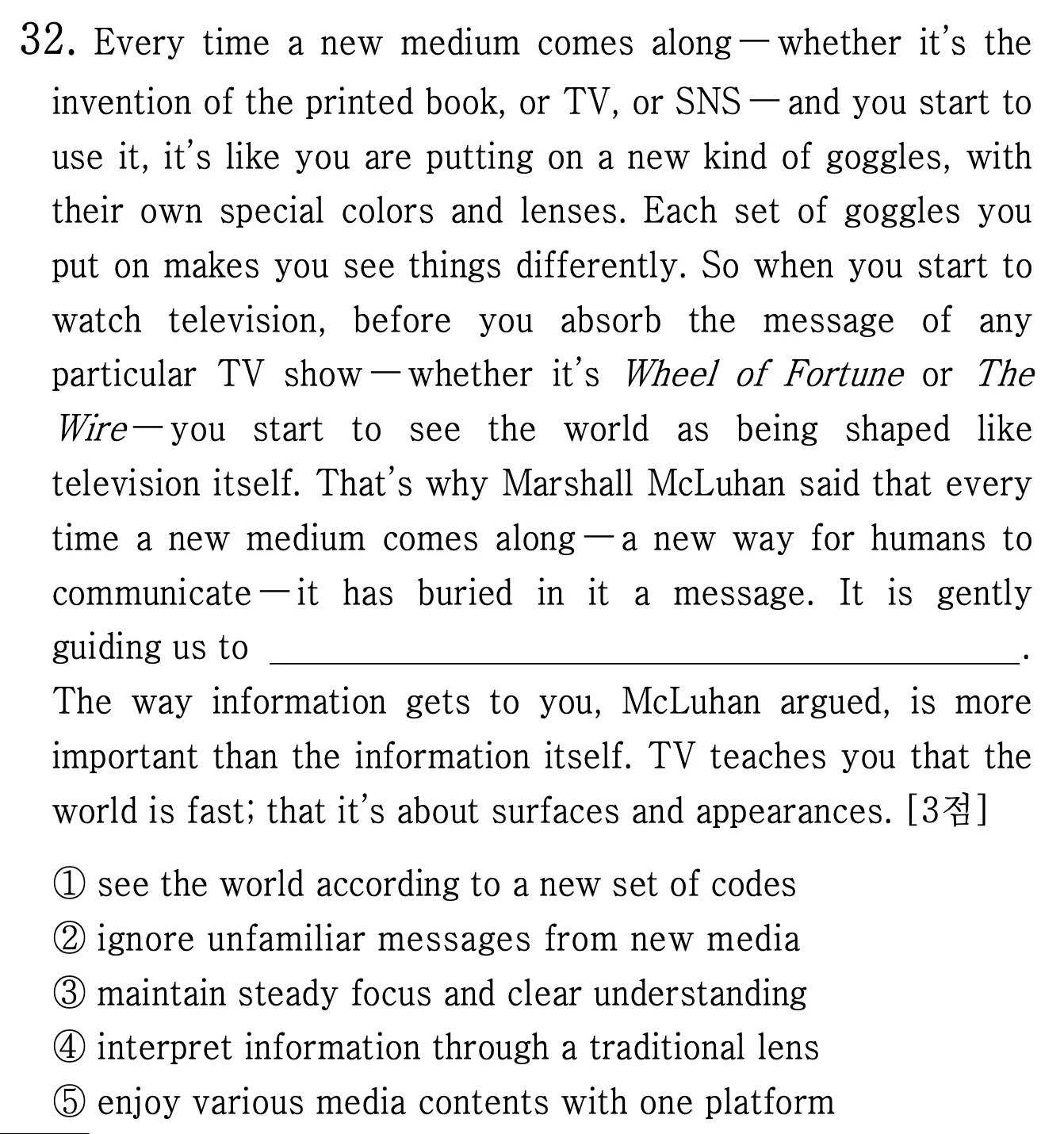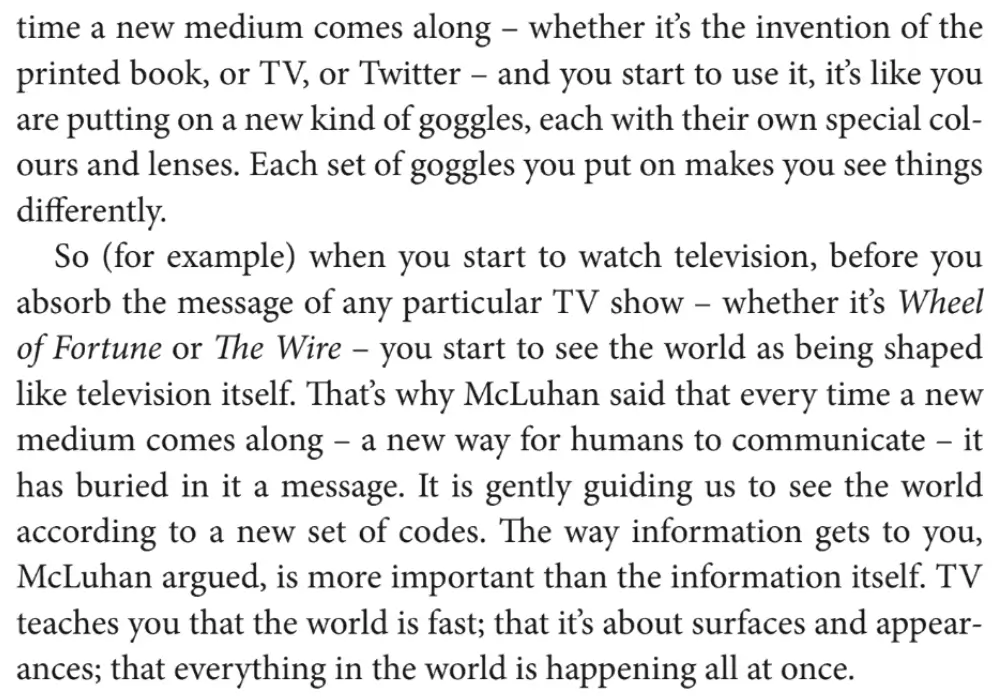 Every time a new medium comes along ─ whether it's the invention of the printed book, or TV, or SNS ─ and you start to use it, it's like you are putting on a new kind of goggles, with their own special colors and lenses. Each set of goggles you put on makes you see things differently. So when you start to watch television, before you absorb the message of any particular TV show ─ whether it's Wheel of Fortune or The Wire ─ you start to see the world as being shaped like television itself. That's why Marshall McLuhan said that every time a new medium comes along ─ a new way for humans to communicate ─ it has buried in it a message. It is gently guiding us to see the world according to a new set of codes. The way information gets to you, McLuhan argued, is more important than the information itself. TV teaches you that the world is fast; that it's about surfaces and appearances.