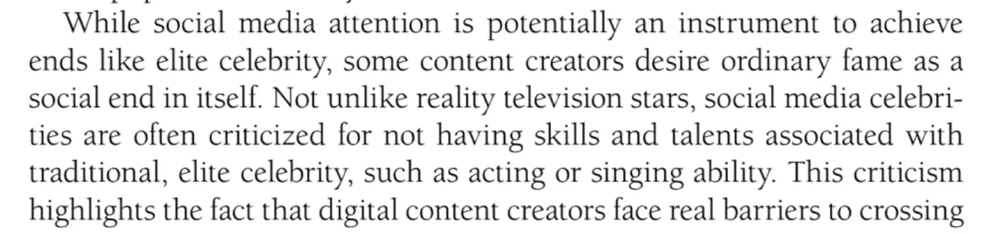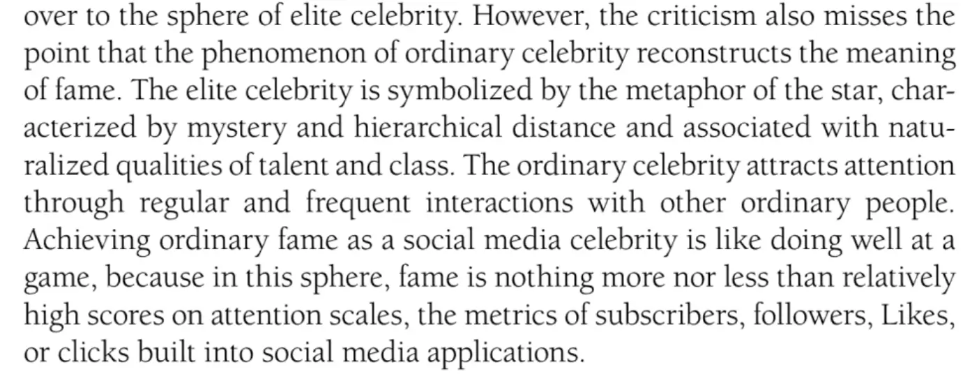While social media attention is potentially an instrument to achieve ends like elite celebrity, some content creators desire ordinary fame as a social end in itself. Not unlike reality television stars, social media celebrities are often criticized for not having skills and talents associated with traditional, elite celebrity, such as acting or singing ability. This criticism highlights the fact that digital content creators face real barriers to crossing over to the sphere of elite celebrity. However, the criticism also misses the point that the phenomenon of ordinary celebrity reconstructs the meaning of fame. The elite celebrity is symbolized by the metaphor of the star, characterized by mystery and hierarchical distance and associated with naturalized qualities of talent and class. The ordinary celebrity attracts attention through regular and frequent interactions with other ordinary people. Achieving ordinary fame as a social media celebrity is like doing well at a game, because in this sphere, fame is nothing more nor less than relatively high scores on attention scales, the metrics of subscribers, followers, Likes, or clicks built into social media applications.