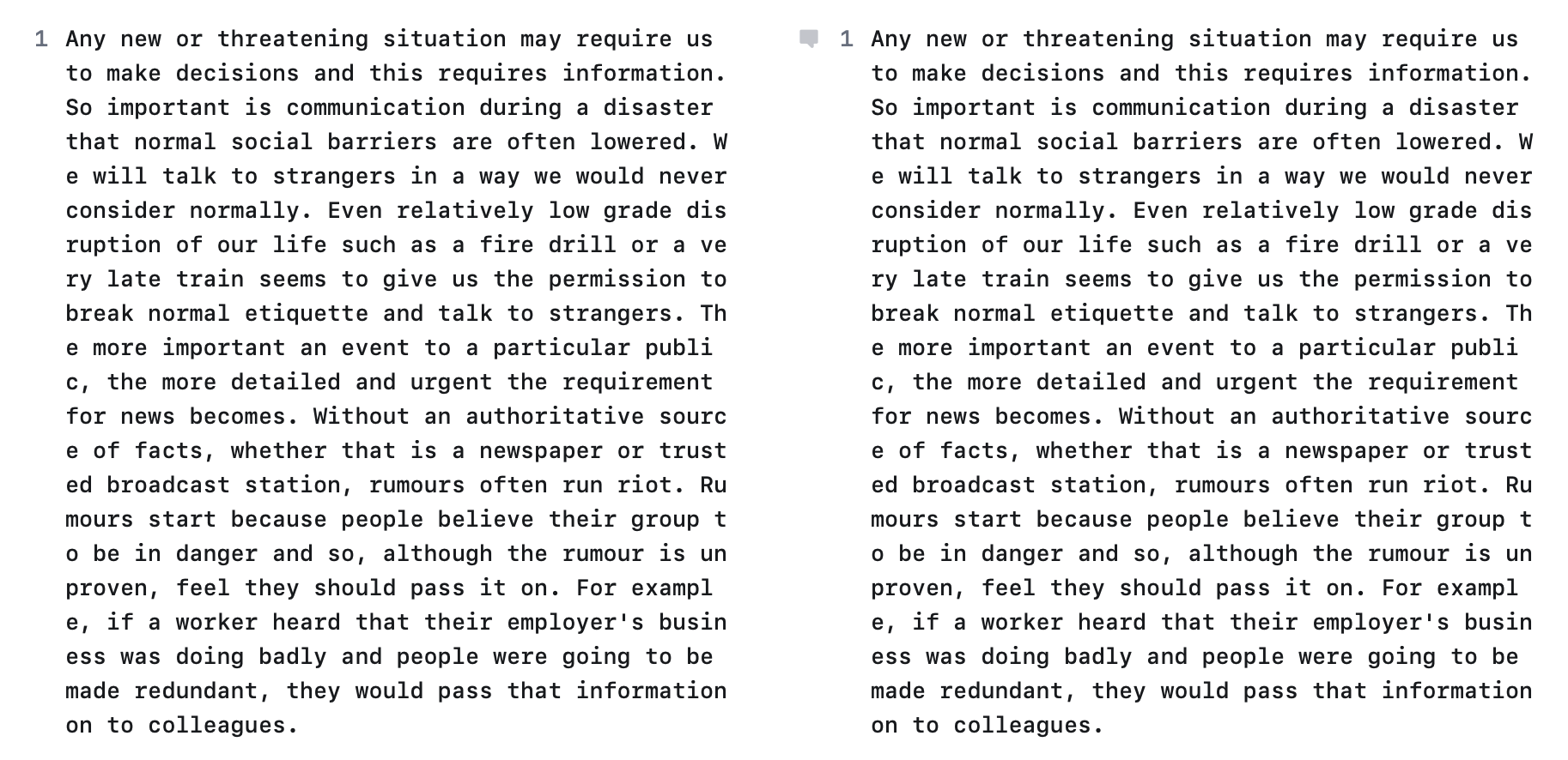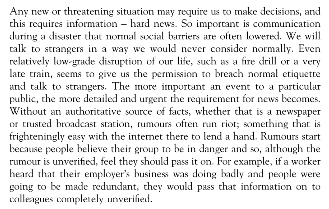 Any new or threatening situation may require us to make decisions and this requires information. So important is communication during a disaster that normal social barriers are often lowered. We will talk to strangers in a way we would never consider normally. Even relatively low grade disruption of our life such as a fire drill or a very late train seems to give us the permission to break normal etiquette and talk to strangers. The more important an event to a particular public, the more detailed and urgent the requirement for news becomes. Without an authoritative source of facts, whether that is a newspaper or trusted broadcast station, rumours often run riot. Rumours start because people believe their group to be in danger and so, although the rumour is unproven, feel they should pass it on. For example, if a worker heard that their employer's business was doing badly and people were going to be made redundant, they would pass that information on to colleagues.