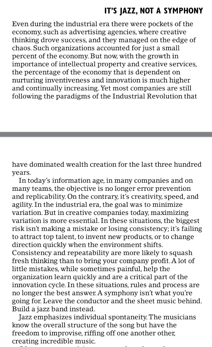 IT’S JAZZ, NOT A SYMPHONY Even during the industrial era there were pockets of the economy, such as advertising agencies, where creative thinking drove success, and they managed on the edge of chaos. Such organizations accounted for just a small percent of the economy. But now, with the growth in importance of intellectual property and creative services, the percentage of the economy that is dependent on nurturing inventiveness and innovation is much higher and continually increasing. Yet most companies are still following the paradigms of the Industrial Revolution that have dominated wealth creation for the last three hundred years. In today’s information age, in many companies and on many teams, the objective is no longer error prevention and replicability. On the contrary, it’s creativity, speed, and agility. In the industrial era, the goal was to minimize variation. But in creative companies today, maximizing variation is more essential. In these situations, the biggest risk isn’t making a mistake or losing consistency; it’s failing to attract top talent, to invent new products, or to change direction quickly when the environment shifts. Consistency and repeatability are more likely to squash fresh thinking than to bring your company profit. A lot of little mistakes, while sometimes painful, help the organization learn quickly and are a critical part of the innovation cycle. In these situations, rules and process are no longer the best answer. A symphony isn’t what you're going for. Leave the conductor and the sheet music behind. Build a jazz band instead. Jazz emphasizes individual spontaneity. The musicians know the overall structure of the song but have the freedom to improvise, riffing off one another, creating incredible music. |