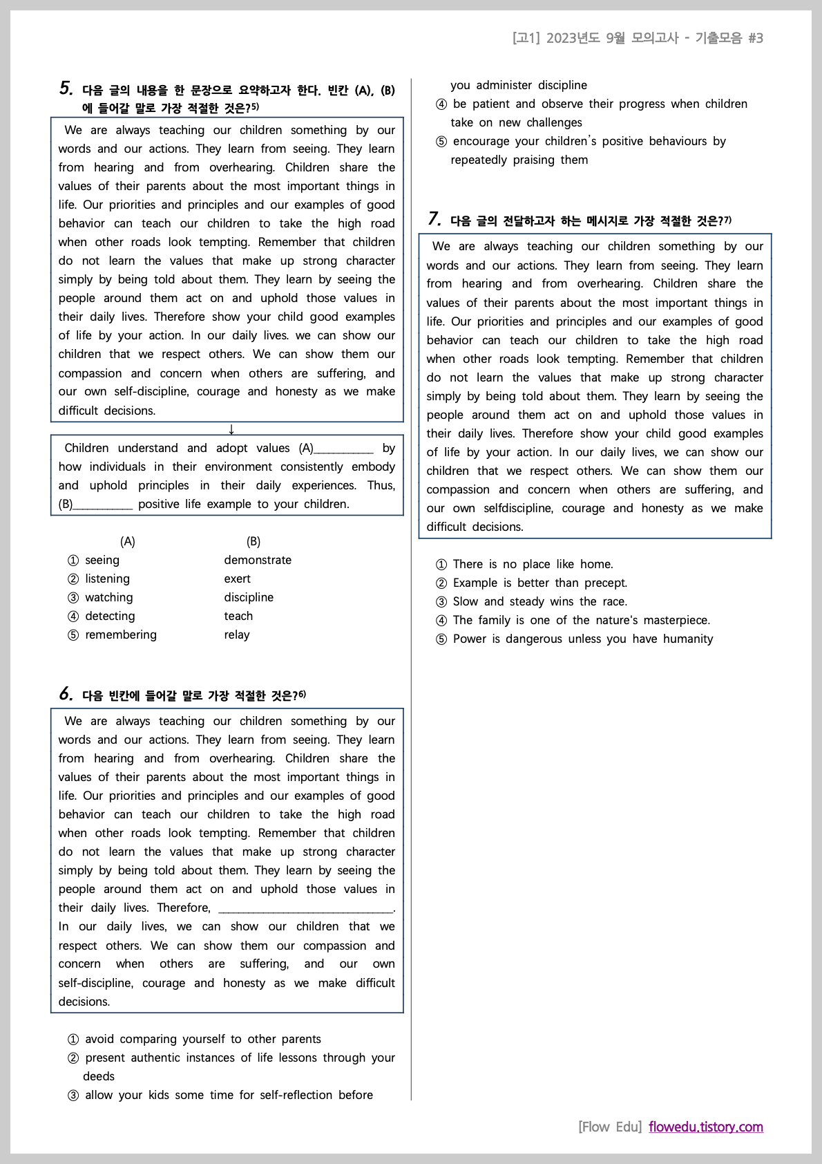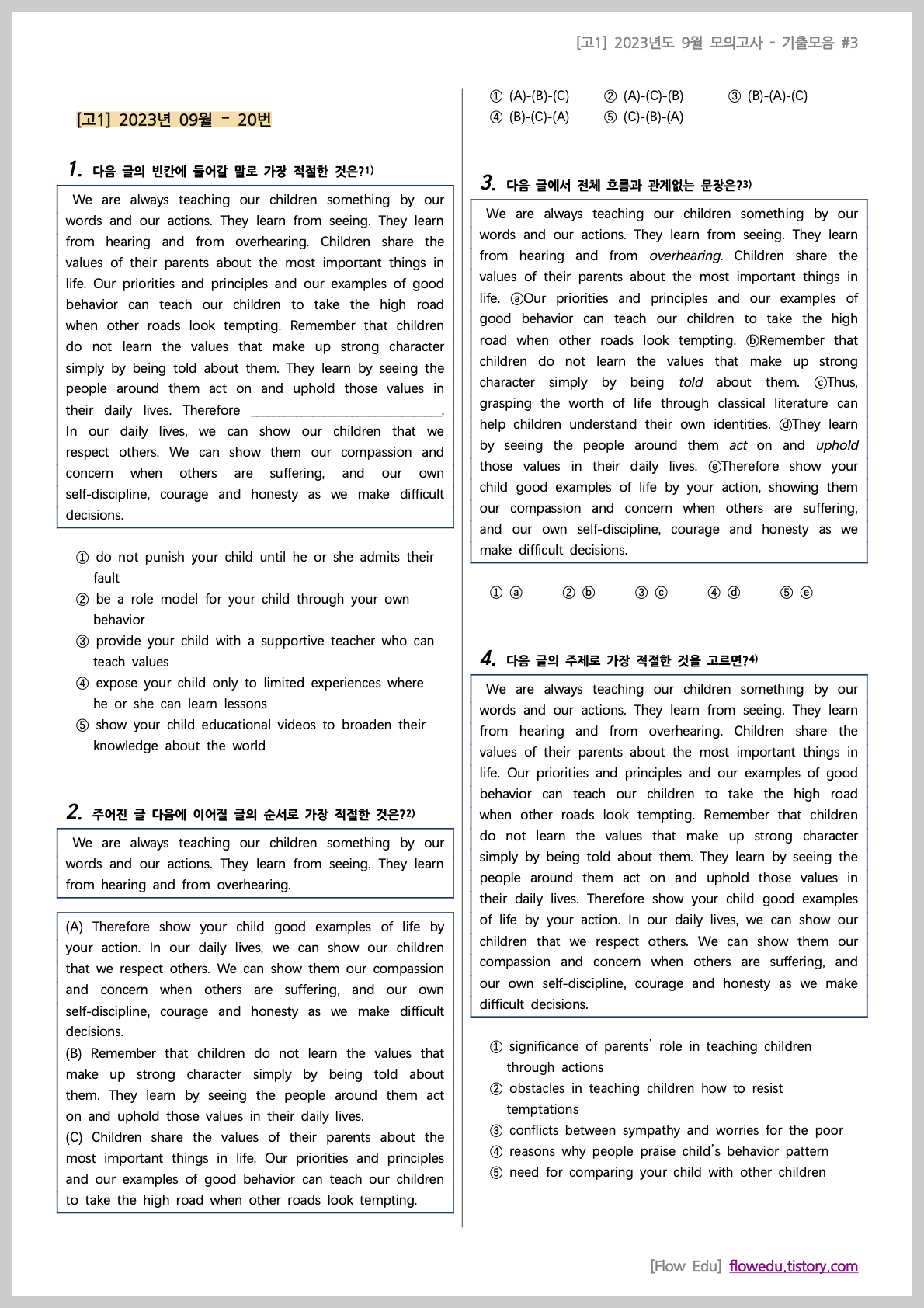 안녕하세요, Flow 영어연구소입니다. 오늘은 고1 2023년도 9월 모의고사>의 기출문제 모음 첫번째 자료를 올립니다.[고1] 2023년 9월 기출모음 #1 - 212문항과거 학교에서 출제됐던 기출 문제들을 문항