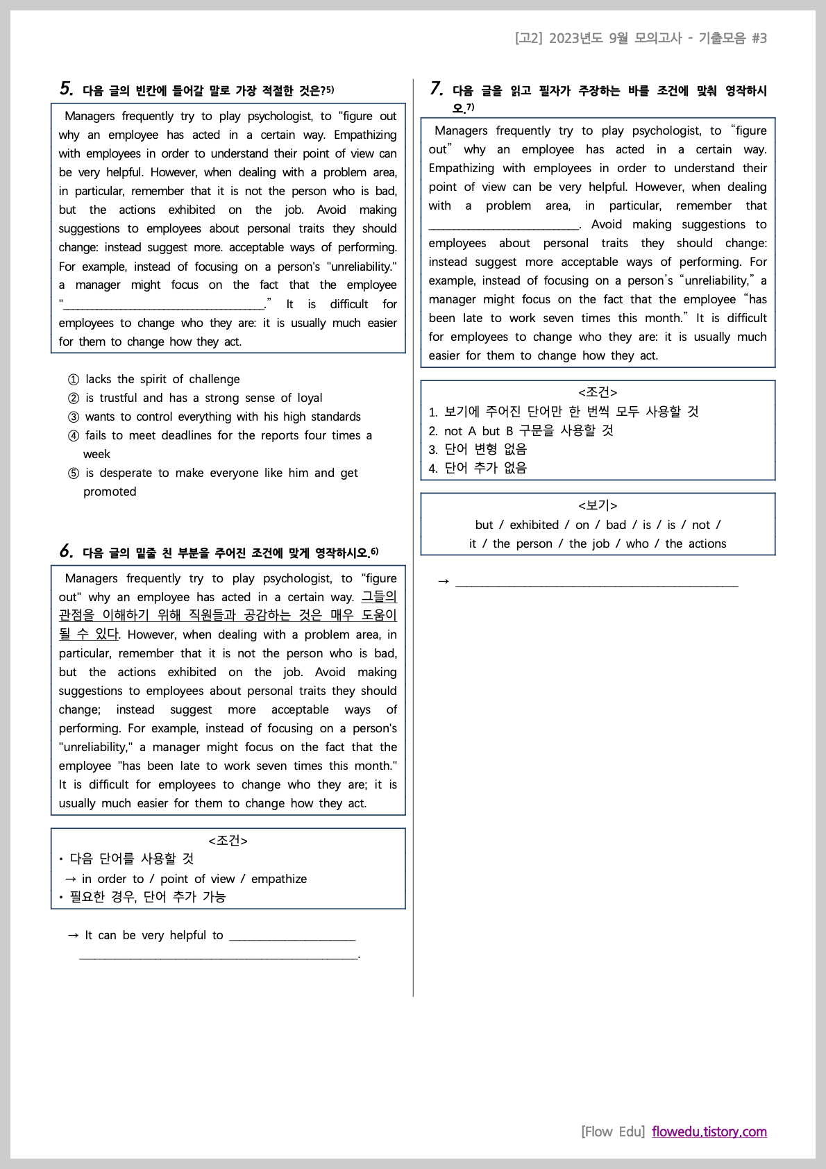 안녕하세요, Flow 영어연구소입니다. 오늘은 고2 2023년도 9월 모의고사>의 기출문제 모음 첫번째 자료를 올립니다.[고2] 2023년 9월 기출모음 #1 - 197문항과거 학교에서 출제됐던 기출 문제들을 문항