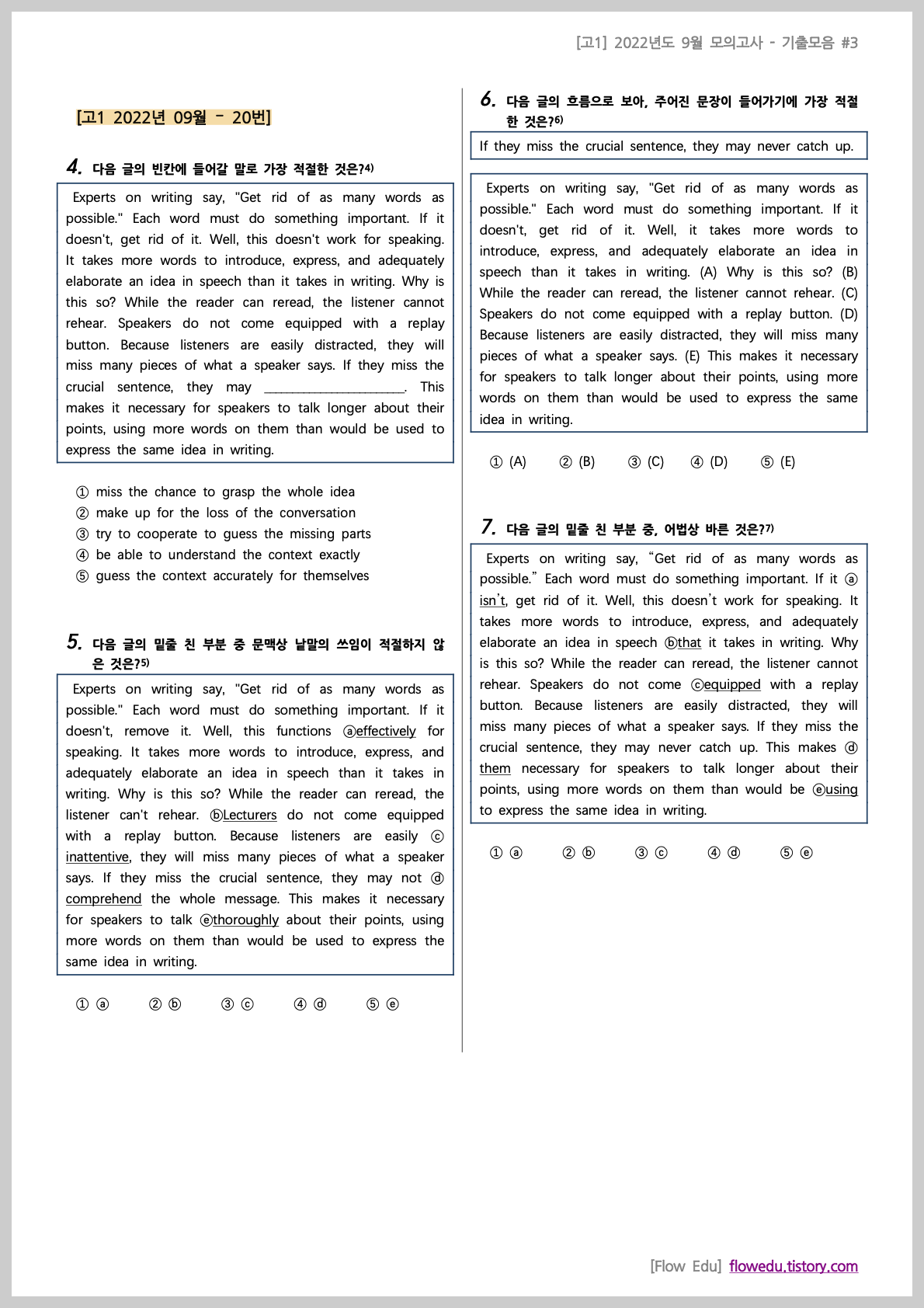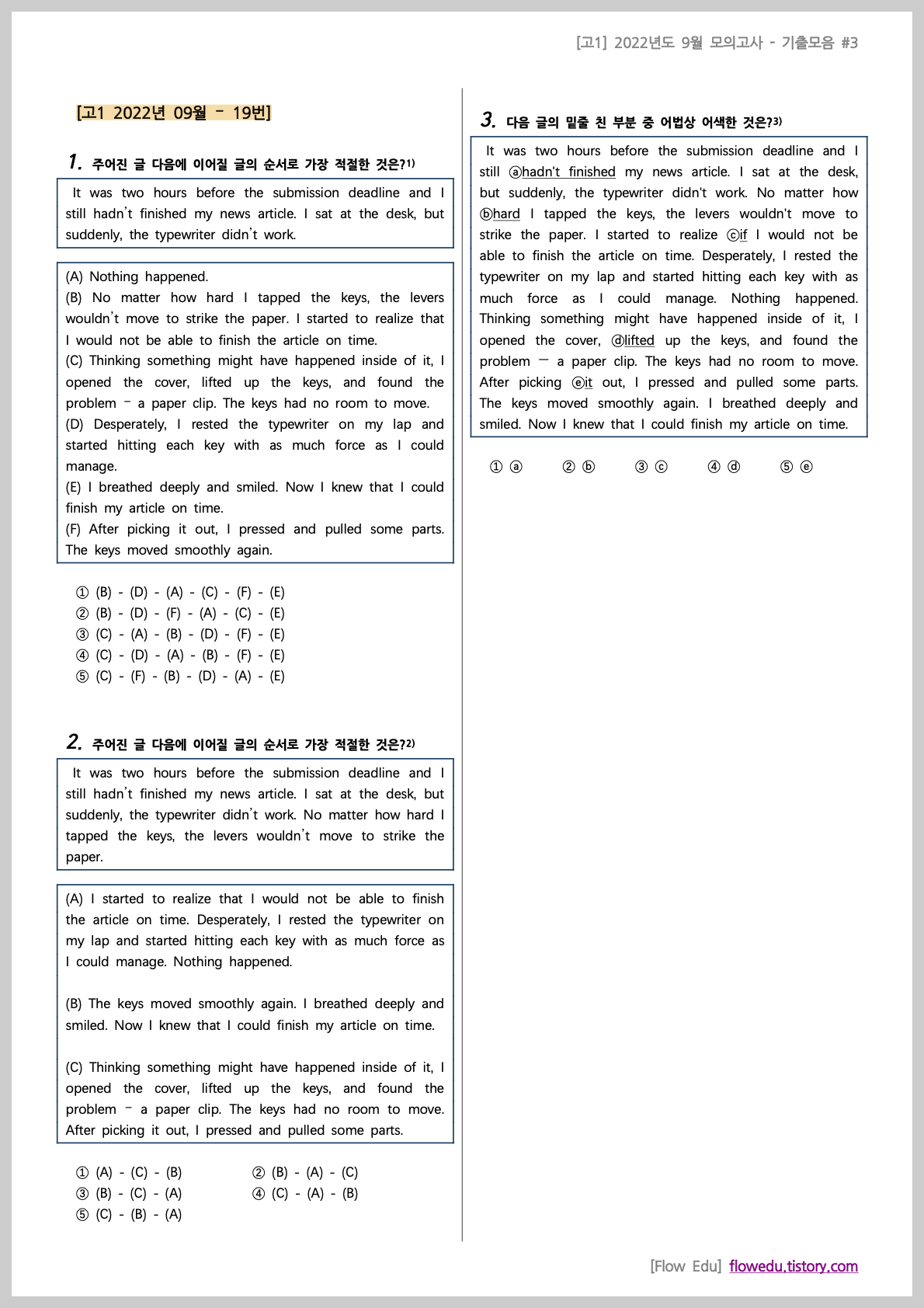 안녕하세요, Flow 영어연구소입니다. 오늘은 고1 2022년도 9월 모의고사>의 기출문제 모음 2번째 자료를 올립니다.[고1] 2022년 9월 기출모음 #2 - 196문항과거 학교에서 출제됐던 기출 문제들을 문항