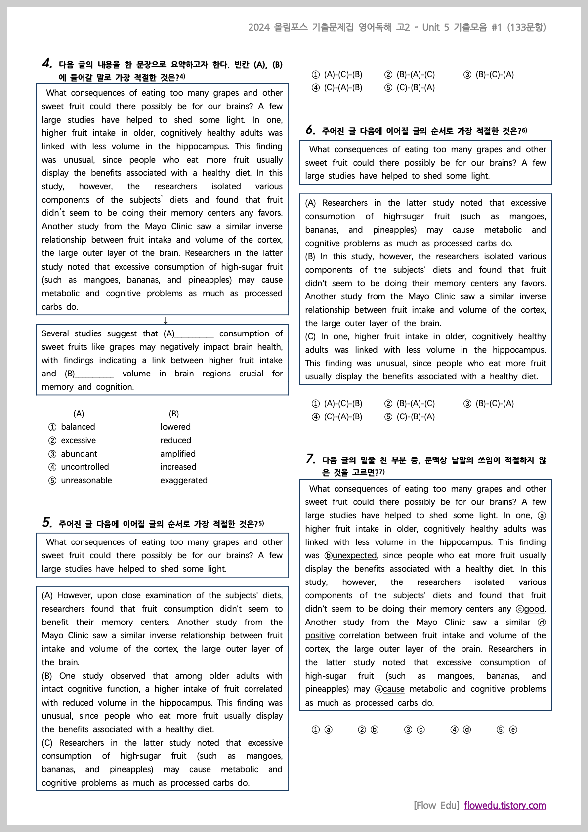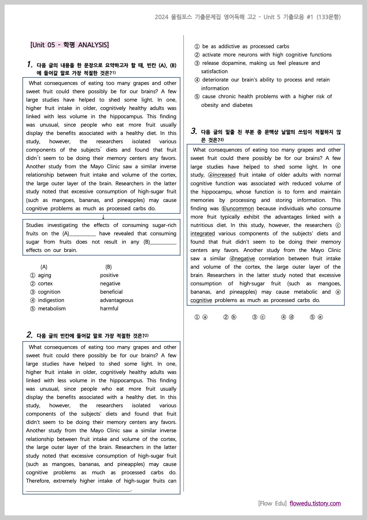 안녕하세요, Flow 영어연구소입니다. 2024 올림포스 기출문제집 영어독해 고2>의 Unit 1 - 기출문제 모음 #1 (76문항) 올립니다.과거 학교에서 출제됐던 기출 문제들을 문항별로 수집한 자료이