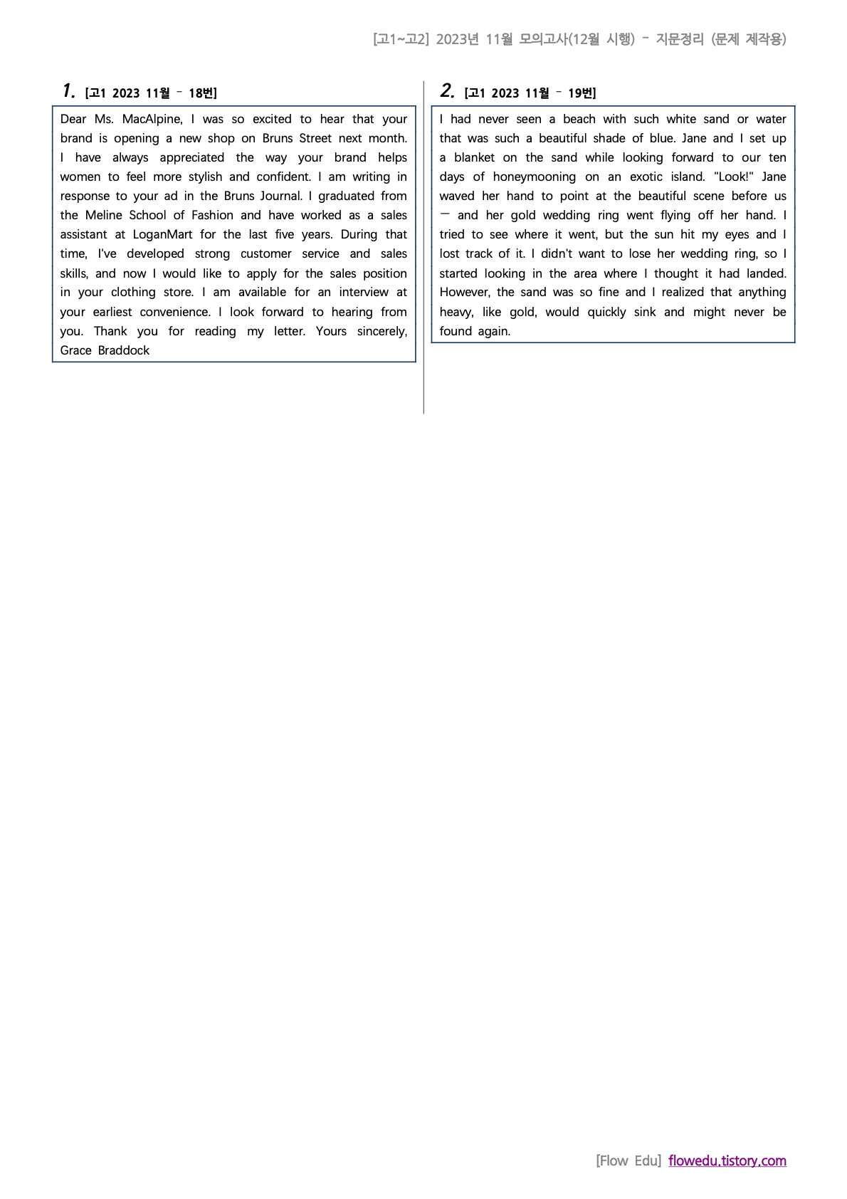 안녕하세요, Flow 영어연구소입니다. 오늘은 고2 2023년도 11월 모의고사(12월 시행)>의 기출문제 모음 1번째 자료를 올립니다.[고2] 2023년 11월 기출모음 #1 - 71문항 이번 모의고사는 2023년 12월 19일