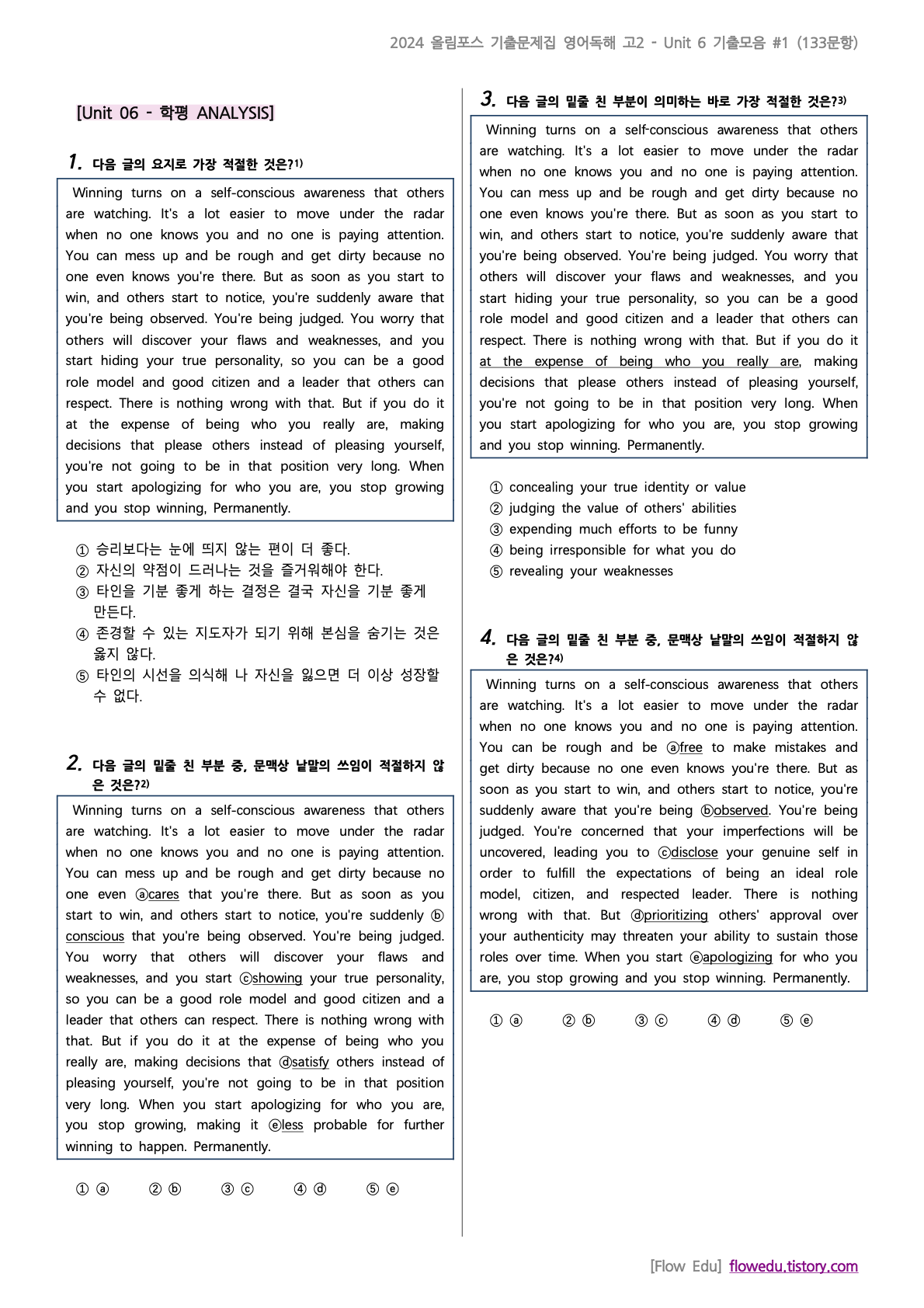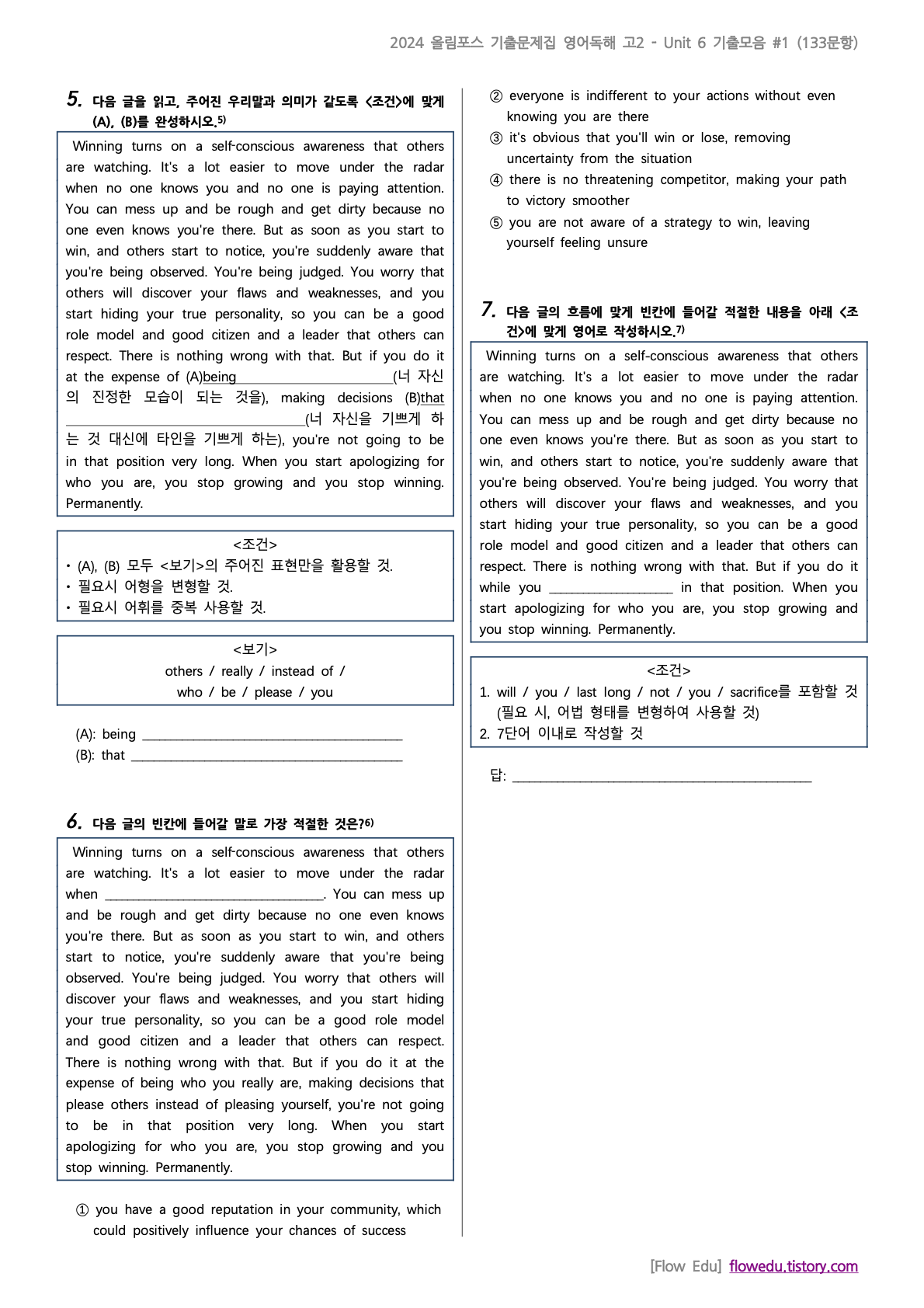 <2024 올림포스 기출문제집 영어독해 고2>의 Unit 6 - 기출문제 모음 #1 (133문항) 올립니다.