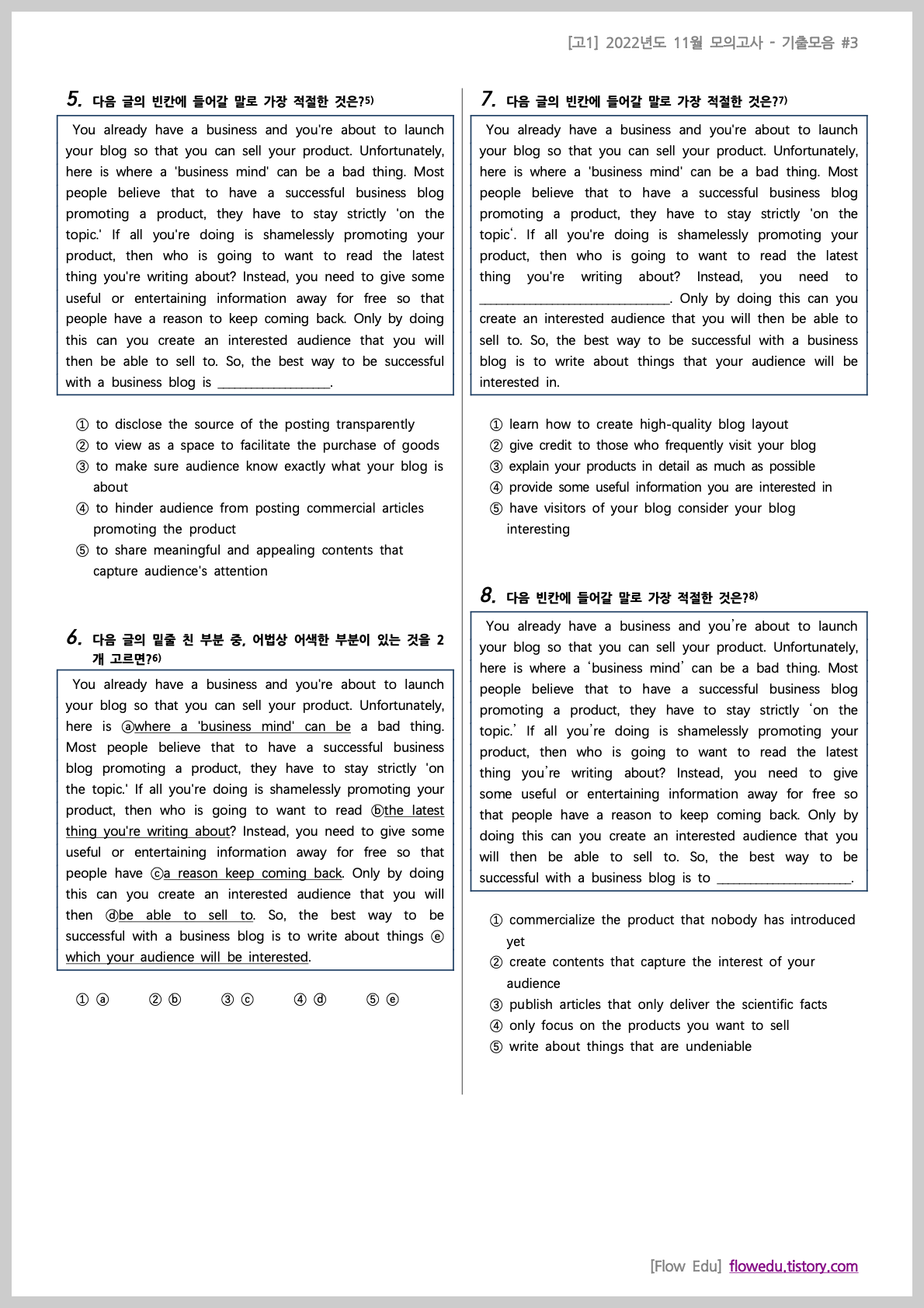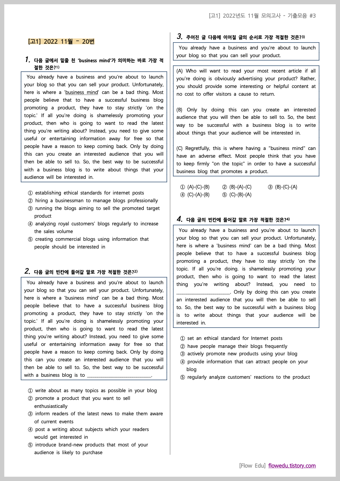 안녕하세요, Flow 영어연구소입니다. 오늘은 고1 2022년도 11월 모의고사>의 기출문제 모음 1번째 자료를 올립니다.[고1] 2022년 11월 기출모음 #1 - 211문항과거 학교에서 출제됐던 기출 문제들을 문