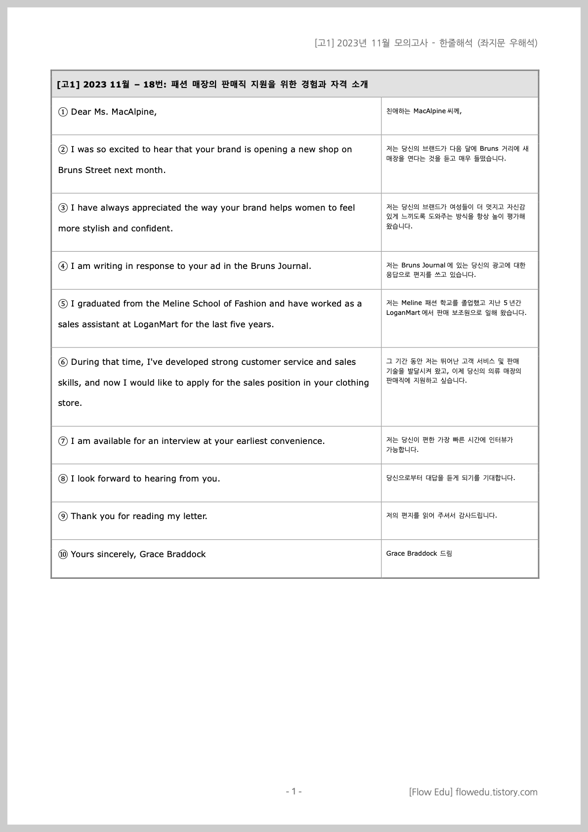 | ① Dear Ms. MacAlpine, | 친애하는 MacAlpine씨께, |