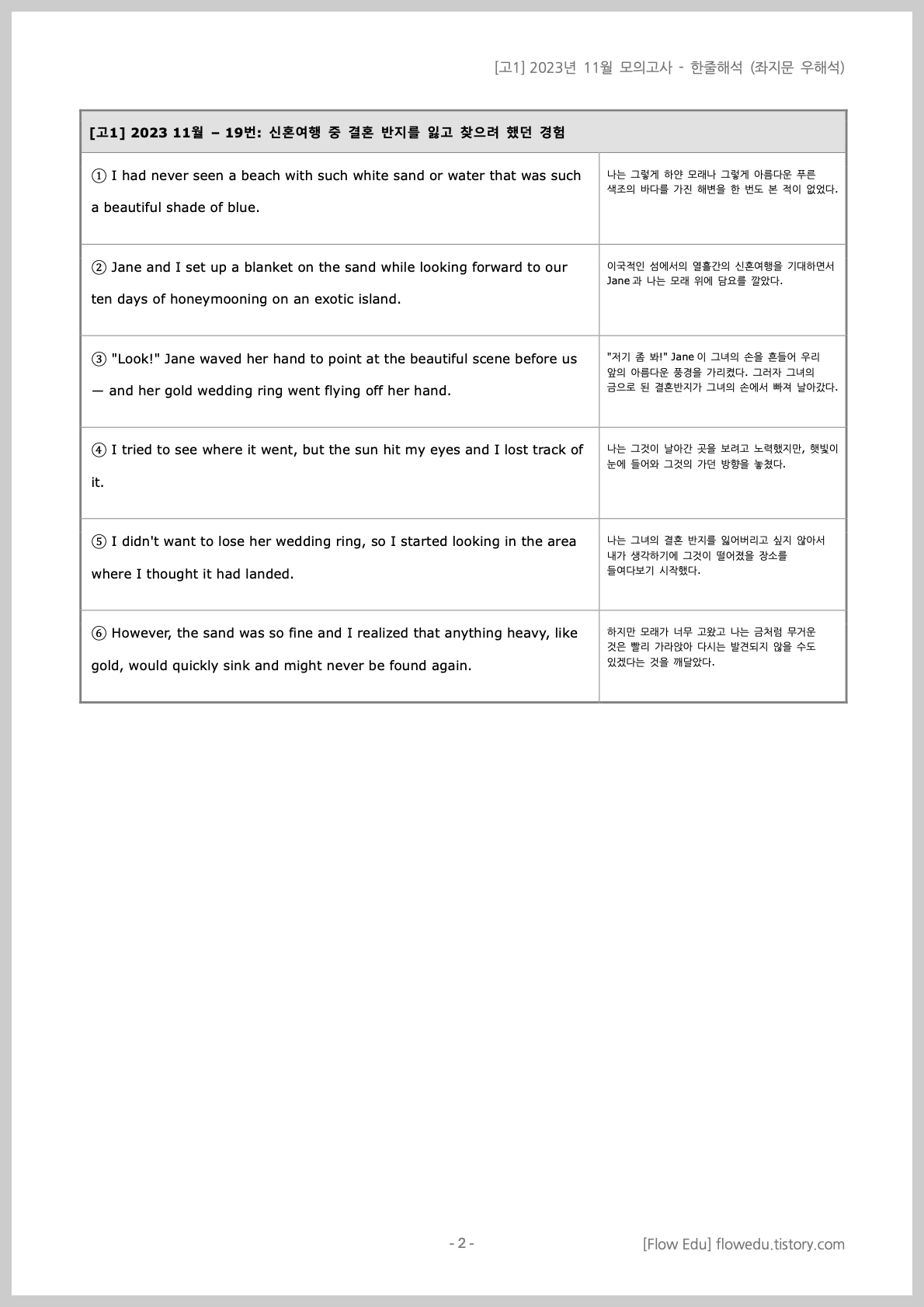 | [고1] 2023 11월 – 19번: 신혼여행 중 결혼 반지를 잃고 찾으려 했던 경험 | |