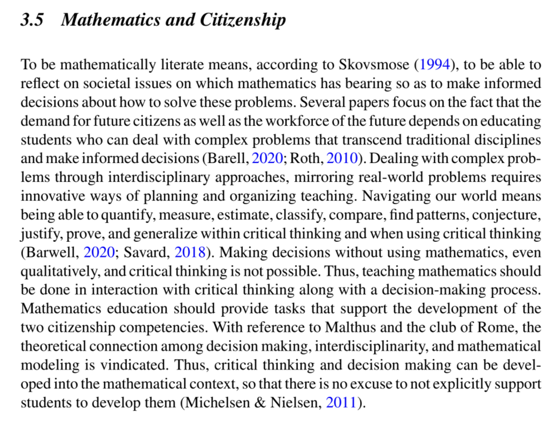 3.5 Mathematics and Citizenship To be mathematically literate means to be able to reflect on societal issues on which mathematics has bearing so as to make informed decisions about how to solve these problems. Several papers focus on the fact that the demand for future citizens as well as the workforce of the future depends on educating students who can deal with complex problems that transcend traditional disciplines and make informed decisions. Dealing with complex problems through interdisciplinary approaches, mirtoring real-world problems requires innovative ways of planning and organizing teaching. Navigating our world means being able to quantify, measure, estimate, classify, compare, find patterns, conjecture, justify, prove, and generalize within critical thinking and when using critical thinking. Making decisions without using mathematics, even qualitatively, and critical thinking is not possible. Thus, teaching mathematics should be done in interaction with critical thinking along with a decision-making process. Mathematics education should provide tasks that support the development of the two citizenship competencies. With reference to Malthus and the club of Rome, the theoretical connection among decision making, interdisciplinarity, and mathematical modeling is vindicated. Thus, critical thinking and decision making can be developed into the mathematical context, so that there is no excuse to not explicitly support students to develop them. |