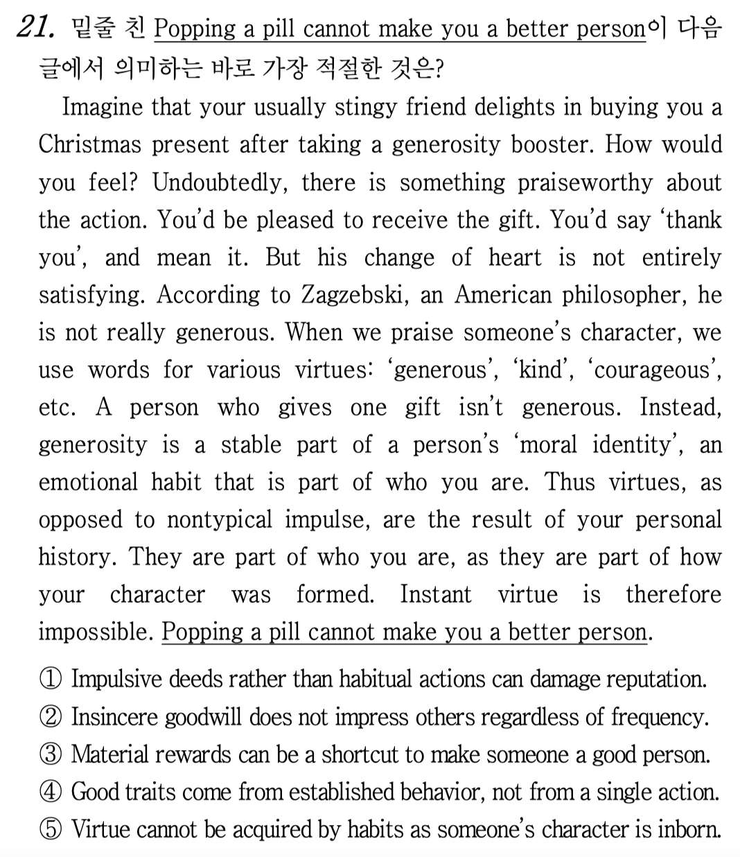 [고2] 2024년 10월 – 21번: 덕목은 일시적 충동이 아니라 지속적인 도덕적 습관에서 형성됨