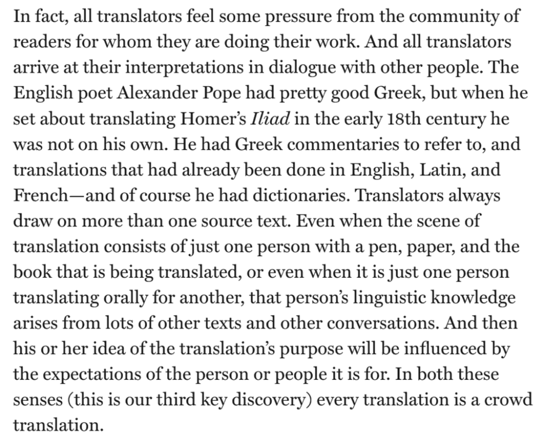 All translators feel some pressure from the community of readers for whom they are doing their work. And all translators arrive at their interpretations in dialogue with other people. The English poet Alexander Pope had pretty good Greek, but when he set about translating Homer's Iliad in the early 18th century he was not on his own. He had Greek commentaries to refer to, and translations that had already been done in English, Latin, and French ─ and of course he had dictionaries. Translators always draw on more than one source text. Even when the scene of translation consists of just one person with a pen, paper, and the book that is being translated, or even when it is just one person translating orally for another, that person's linguistic knowledge arises from lots of other texts and other conversations. And then his or her idea of the translation's purpose will be influenced by the expectations of the person or people it is for. In both these senses every translation is a crowd translation.