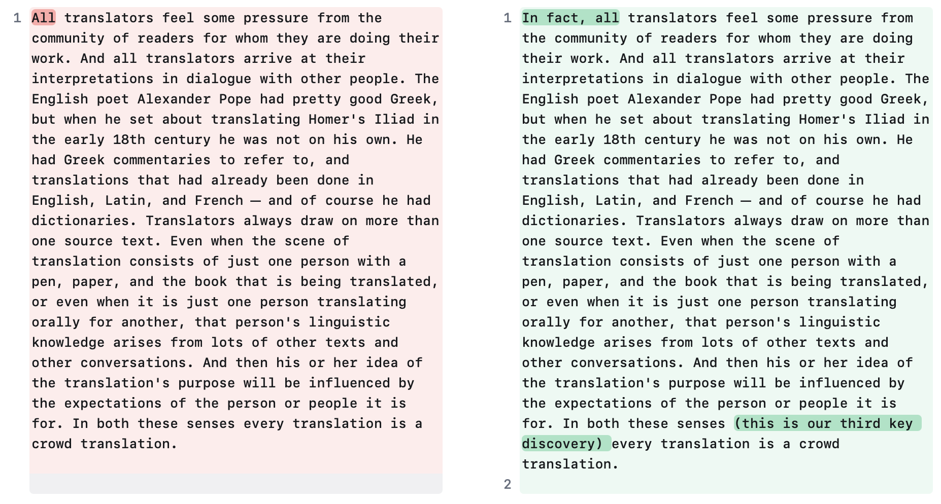 In fact, all translators feel some pressure from the community of readers for whom they are doing their work. And all translators arrive at their interpretations in dialogue with other people. The English poet Alexander Pope had pretty good Greek, but when he set about translating Homer’s Iliad in the early 18th century he was not on his own. He had Greek commentaries to refer to, and translations that had already been done in English, Latin, and French—and of course he had dictionaries. Translators always draw on more than one source text. Even when the scene of translation consists of just one person with a pen, paper, and the book that is being translated, or even when it is just one person translating orally for another, that person’s linguistic knowledge arises from lots of other texts and other conversations. And then his or her idea of the translation’s purpose will be influenced by the expectations of the person or people it is for. In both these senses (this is our third key discovery) every translation is a crowd translation. |
