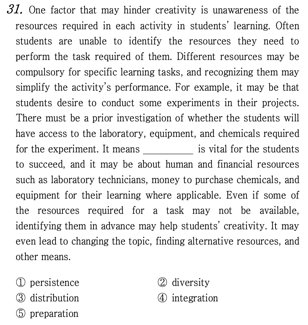 One factor that may hinder creativity is unawareness of the resources required in each activity in students' learning. Often students are unable to identify the resources they need to perform the task required of them. Different resources may be compulsory for specific learning tasks, and recognizing them may simplify the activity's performance. For example, it may be that students desire to conduct some experiments in their projects. There must be a prior investigation of whether the students will have access to the laboratory, equipment, and chemicals required for the experiment. It means preparation is vital for the students to succeed, and it may be about human and financial resources such as laboratory technicians, money to purchase chemicals, and equipment for their learning where applicable. Even if some of the resources required for a task may not be available, identifying them in advance may help students' creativity. It may even lead to changing the topic, finding alternative resources, and other means.