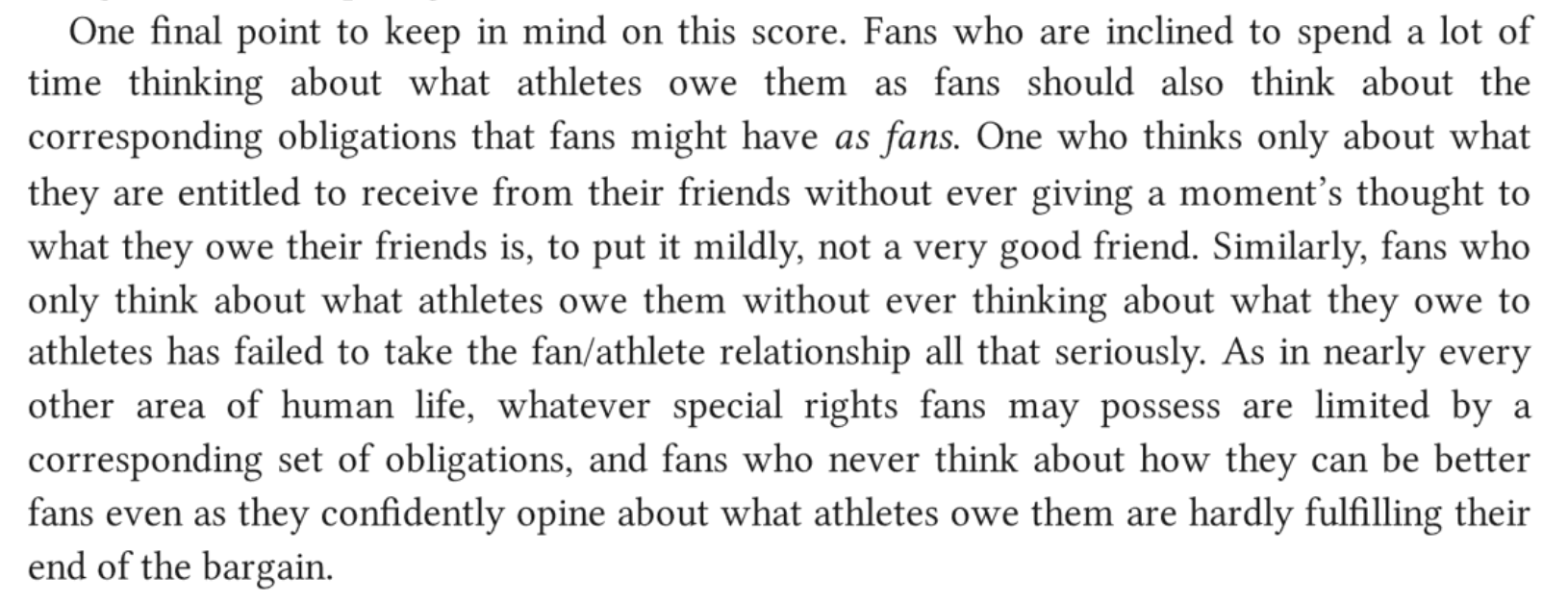Fans who are inclined to spend a lot of time thinking about what athletes owe them as fans should also think about the corresponding obligations that fans might have as fans. One who thinks only about what they are entitled to receive from their friends without ever giving a moment's thought to what they owe their friends is, to put it mildly, not a very good friend. Similarly, fans who only think about what athletes owe them without ever thinking about what they owe to athletes have failed to take the fan/athlete relationship all that seriously. As in nearly every other area of human life, whatever special rights fans may possess are limited by a corresponding set of obligations, and fans who never think about how they can be better fans even as they confidently opine about what athletes owe them are hardly fulfilling their end of the bargain.