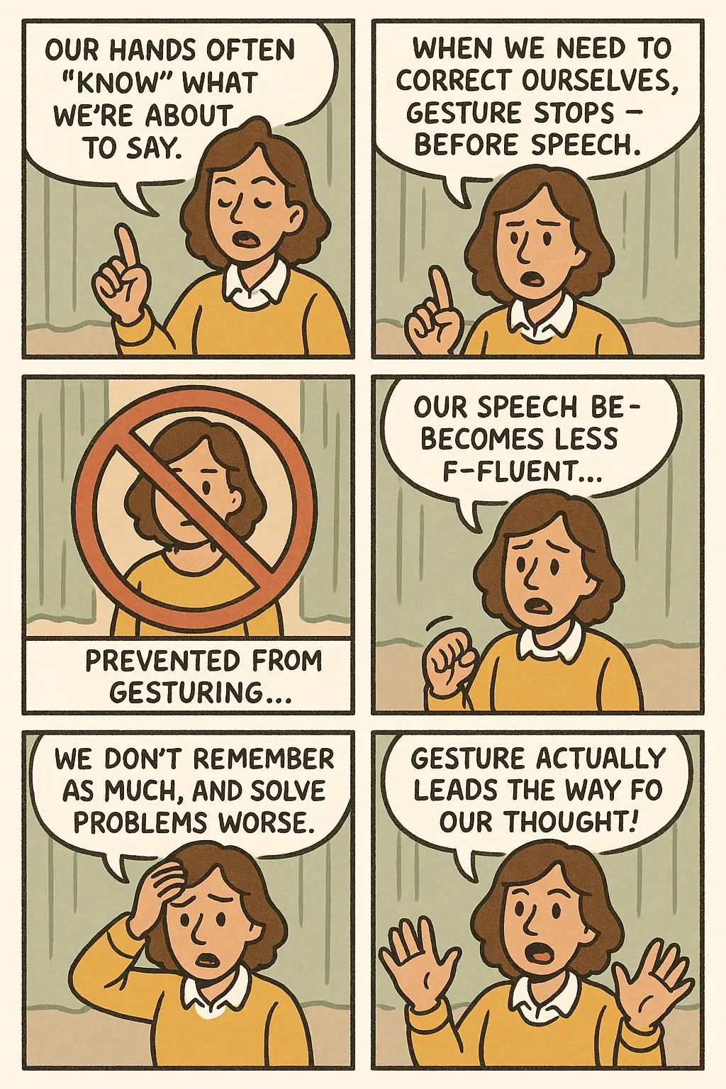 When we realize we've said something in error and we pause to go back to correct it, we stop gesturing a couple of hundred milliseconds before we stop speaking. Such sequences suggest the startling notion that our hands "know" what we're going to say before our conscious minds do, and in fact this is often the case. Gesture can mentally prime a word so that the right term comes to our lips. When people are prevented from gesturing, they talk less fluently; their speech becomes halting because their hands are no longer able to supply them with the next word, and the next. Not being able to gesture has other deleterious effects: without gesture to help our mental processes along, we remember less useful information, we solve problems less well, and we are less able to explain our thinking. Far from tagging along as speech's clumsy companion, gesture represents the leading edge of our thought.