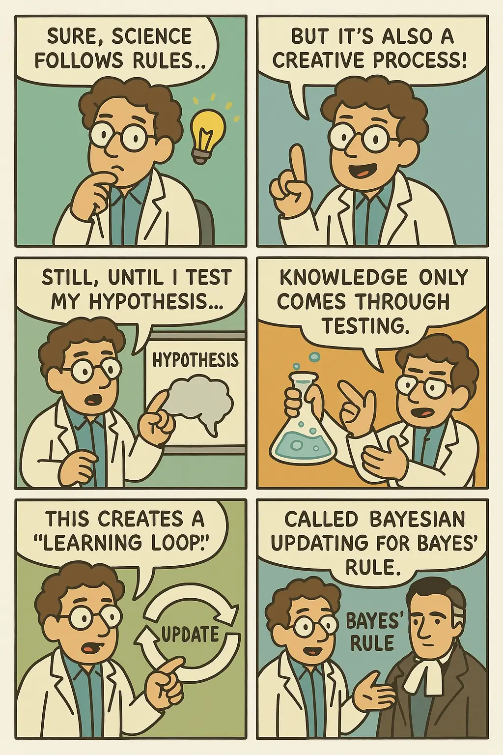 It is important to recognize that although science is a rule-based procedure, it is very much a creative process. A conjecture is a philosophical invention, cooked up rather mystically by the mind through the mental computation we call careful contemplation. However, until the hypothesis is tested against reality, it is not yet truly knowledge; it is just information that represents speculation. Knowledge is information that has demonstrated its usefulness. It is what is left over after cycles of experimental testing have eliminated false theories. As scientists continually test their hypotheses and modify their models to account for new and surprising data, a kind of "learning loop" emerges that statisticians call Bayesian updating. Based on Bayes' Rule, developed by eighteenth-century English statistician and philosopher Thomas Bayes, Bayesian updating refers to a mathematical process whereby an accepted theory or predictive model gets increasingly accurate through the repetitive testing of competing variants of that theory.