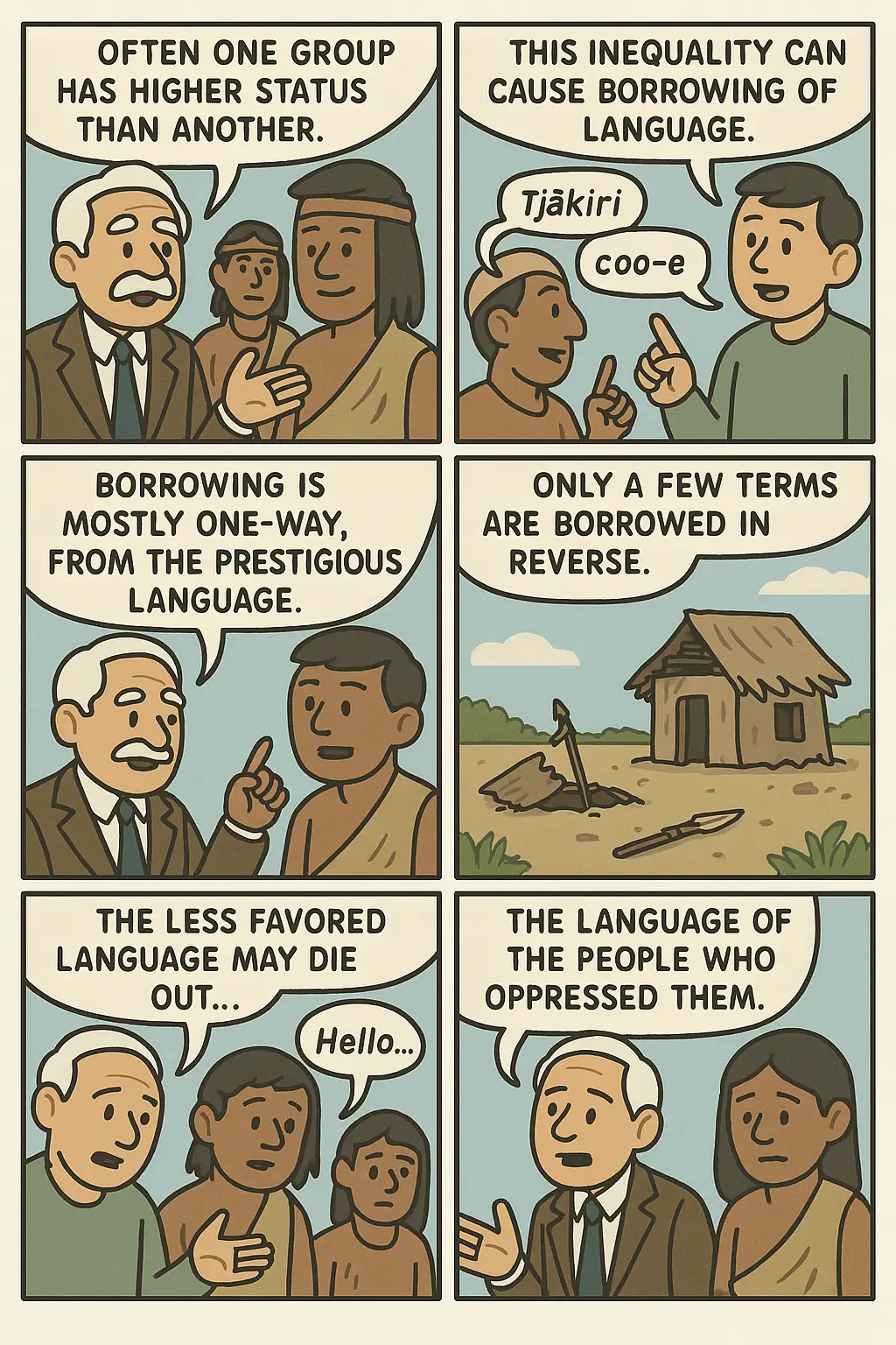 | 예시 | 사회적으로 열위에 있는 집단의 언어는 초기 접촉 시 더 강한 집단에 새로운 용어를 제공하지만, 그 이상의 영향은 제한적일 수 있다. | The languages of socially subordinated groups may from quite an early period of contact provide terminology for objects or practices with which speakers of the more powerful group were previously unfamiliar, but the effects of contact in that direction may not progress any further than this. |