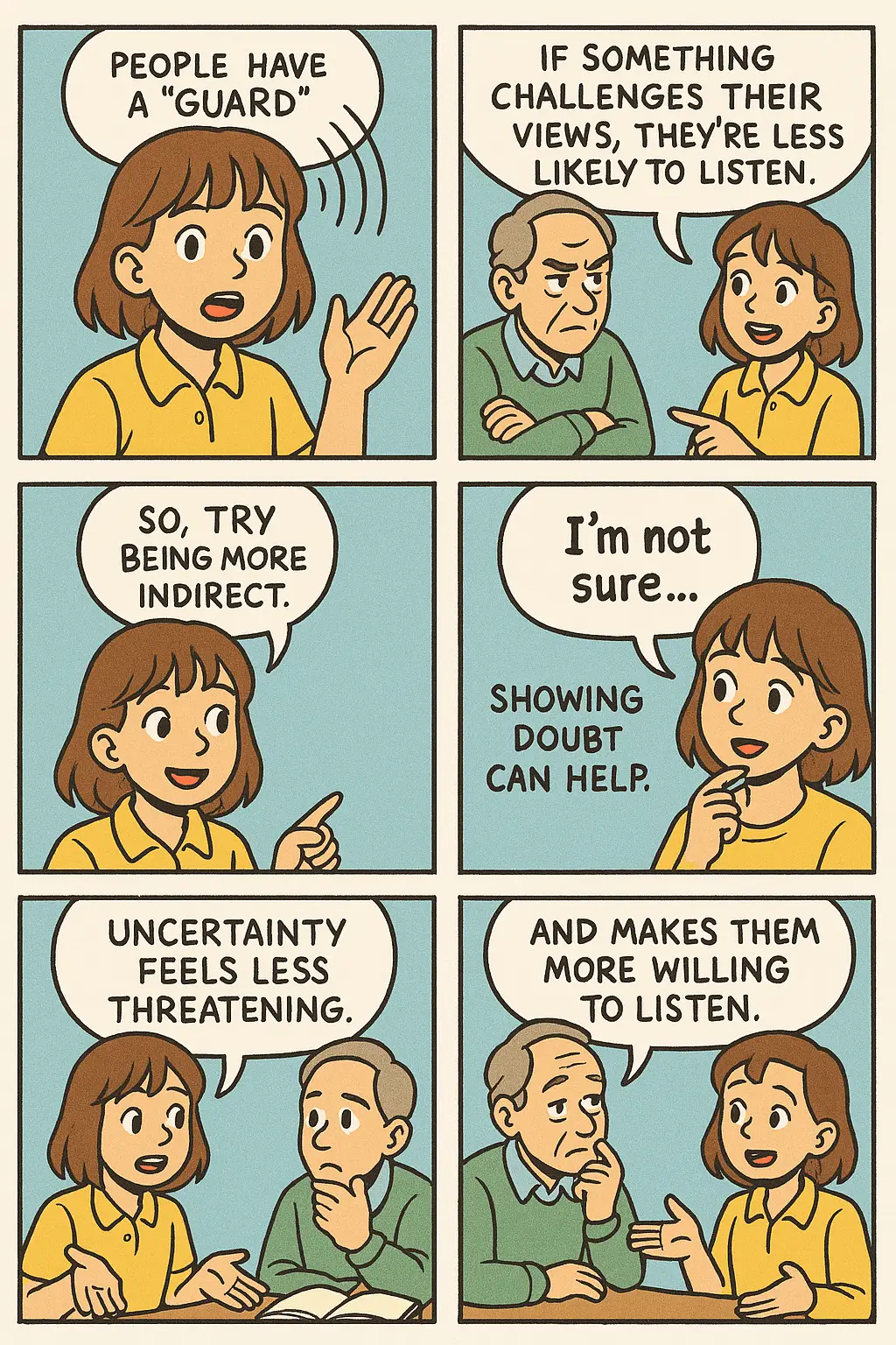| 8 | Expressing doubt about one's own view acknowledges that conflicting beliefs are valid, making the other side feel validated and more willing to listen. | Expressing doubt about one’s own view acknowledges that conflicting beliefs are valid, making the other side feel validated and more willing to listen. |