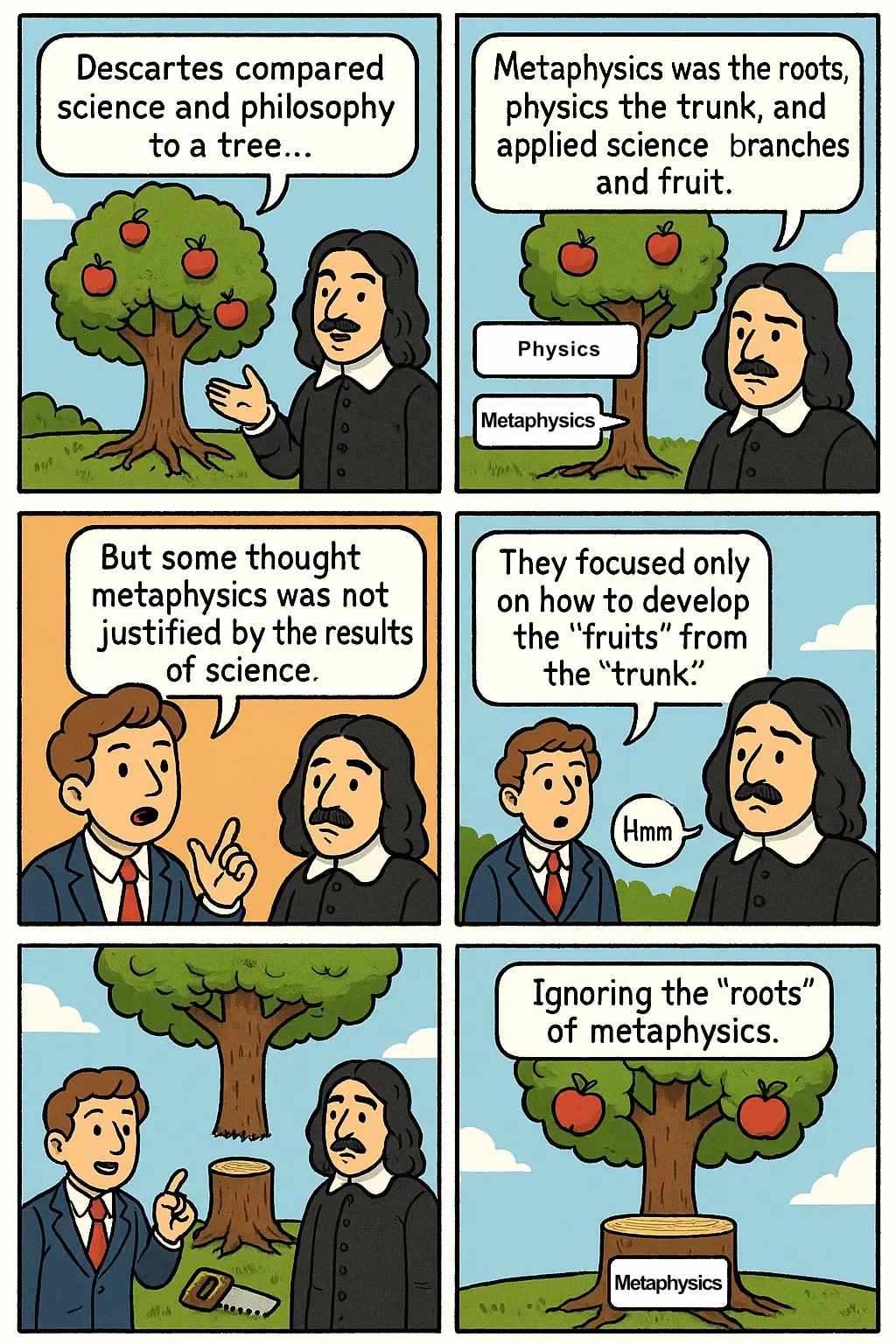 | 결론 | 결과적으로 형이상학은 배제되고 물리학에서 직접 응용으로 이어지는 방식으로 과학이 바뀌었다. | So the tree was cut in the middle. For the derivation of technical results, it was necessary to start from the physical principles in the trunk. Science in the new sense was to think only of how the fruits would develop from the trunk without regard to the roots. |