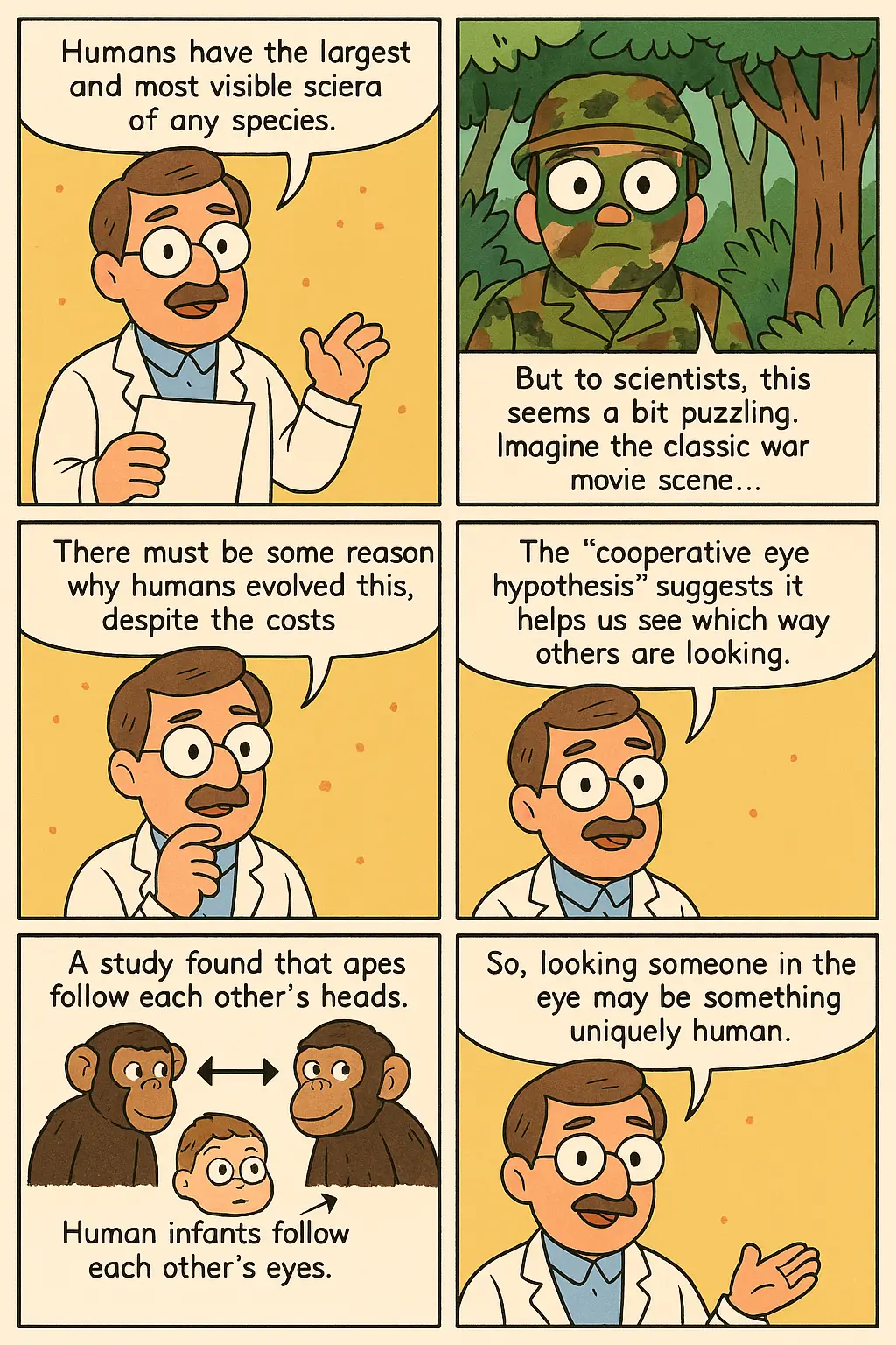 In fact, humans are known to have the largest and most visible sclera ─ the "whites" of the eyes ─ of any species. This fact intrigues scientists, because it would seem actually to be a considerable obstacle: imagine, for example, the classic war movie scene where the soldier dresses in camouflage and paints his face with green and brown color ─ but can do nothing about his noticeably white sclera, beaming bright against the jungle. There must be some reason humans developed it, despite its obvious costs. In fact, the advantage of visible sclera ─ so goes the "cooperative eye hypothesis" ─ is precisely that it enables humans to see clearly, and from a distance, which direction other humans are looking. Michael Tomasello showed in a 2007 study that chimpanzees, gorillas, and bonobos ─ our nearest cousins ─ follow the direction of each other's heads, whereas human infants follow the direction of each other's eyes. So the value of looking someone in the eye may in fact be something uniquely human.