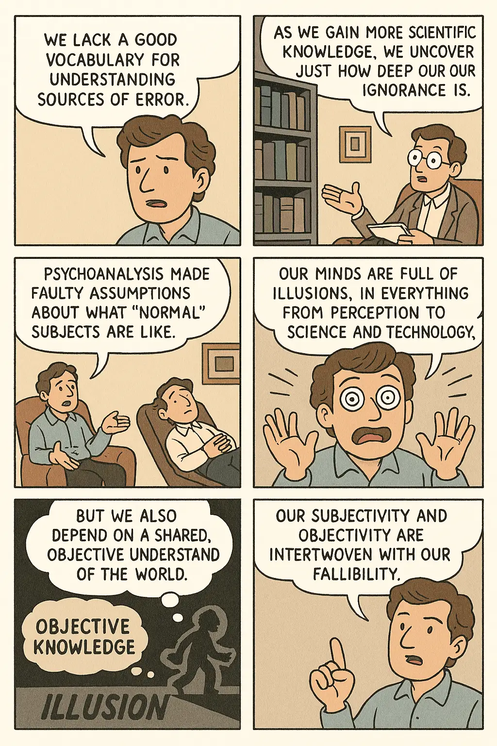 We lack a sufficient vocabulary for making sense of the sources of error. The more scientific knowledge we accumulate, the better we understand that the ignorance over which the knowledge enterprise is built is shockingly deep. For instance, it turned out that psychoanalysis's attempt to delimit the sources of error by categorizing the kinds of mistakes to which humans are subject in light of the therapeutic situation in the talking cure draws on misguided assumptions about the normalcy conditions for subjects. Digging deeper into the structure of the human mind as well as into the specific embodiment of human knowers equipped with a complex nervous system showed that our mental life is filled with illusions on all levels of knowledge acquisition, from sensation to perception, from scientific discourse to the use of technology based on the latest scientific discovery. Yet, once again, we cannot make sense of this picture of ourselves as immersed in the area of ignorance and illusion without at the same time relying on a huge background of shared, objective knowledge that makes our ignorance available to us. Subjectivity and objectivity are interwoven with our fallibility.