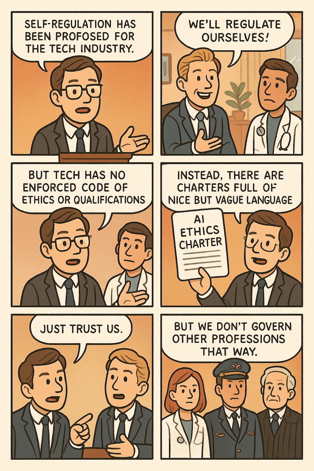Self-regulation has been suggested as an alternative way to hold the tech industry to account. But when tech lobbyists speak of self-regulation, they are not describing it as it is understood by professionals like doctors. Unlike in medicine, there are no mandatory ethical qualifications for working as a software engineer or technology executive. There is no enforceable industry code of conduct. There is no obligatory certification. There is no duty to put the public ahead of profit. There are few consequences for serious moral failings; no real fear of being suspended or struck off. Recent years have seen an explosion of AI ethics charters and the like, filled with well-meaning generalities about the responsible use of powerful computers. But without consequences for violating them, these charters are just toothless statements of aspiration. The tech industry is basically saying: trust us. But blind trust is not how we govern doctors, lawyers, bankers, pilots or anyone else in unelected positions of social responsibility. Tech is the exception, and it's not clear why.
