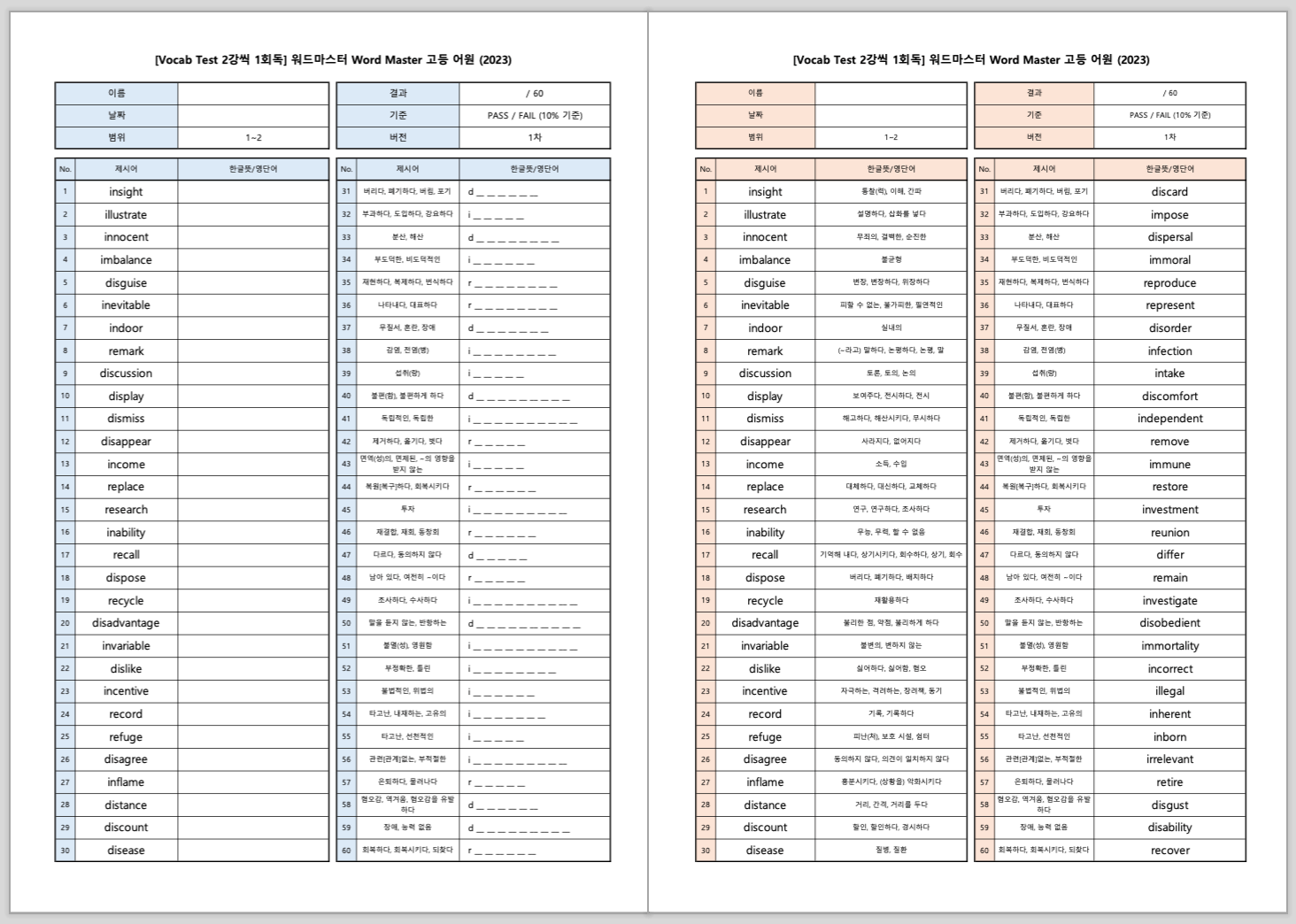 안녕하세요, Flow 영어연구소입니다. 워드마스터 Word Master 하이스트 (2024년도 발행)어휘 시험지 및 답지 PDF 공유합니다.시험지 제작에는 모두 표제어만 이용했습니다. 첫번째 Vocab Test는 1강씩 30문