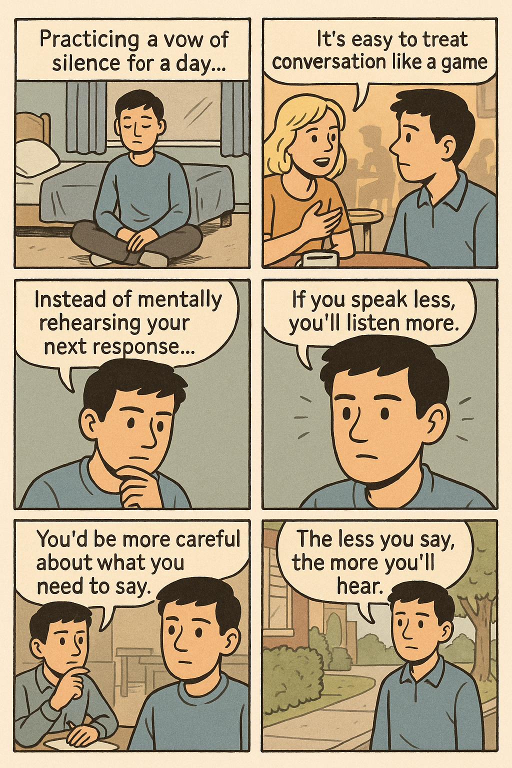 | 문제 제기 | 하루 동안 꼭 필요한 말만 하자는 침묵 실험을 제안한다 | Imagine following the spirit of a silence vow into daily life. Challenge yourself to spend an entire day saying only what you absolutely must say. |