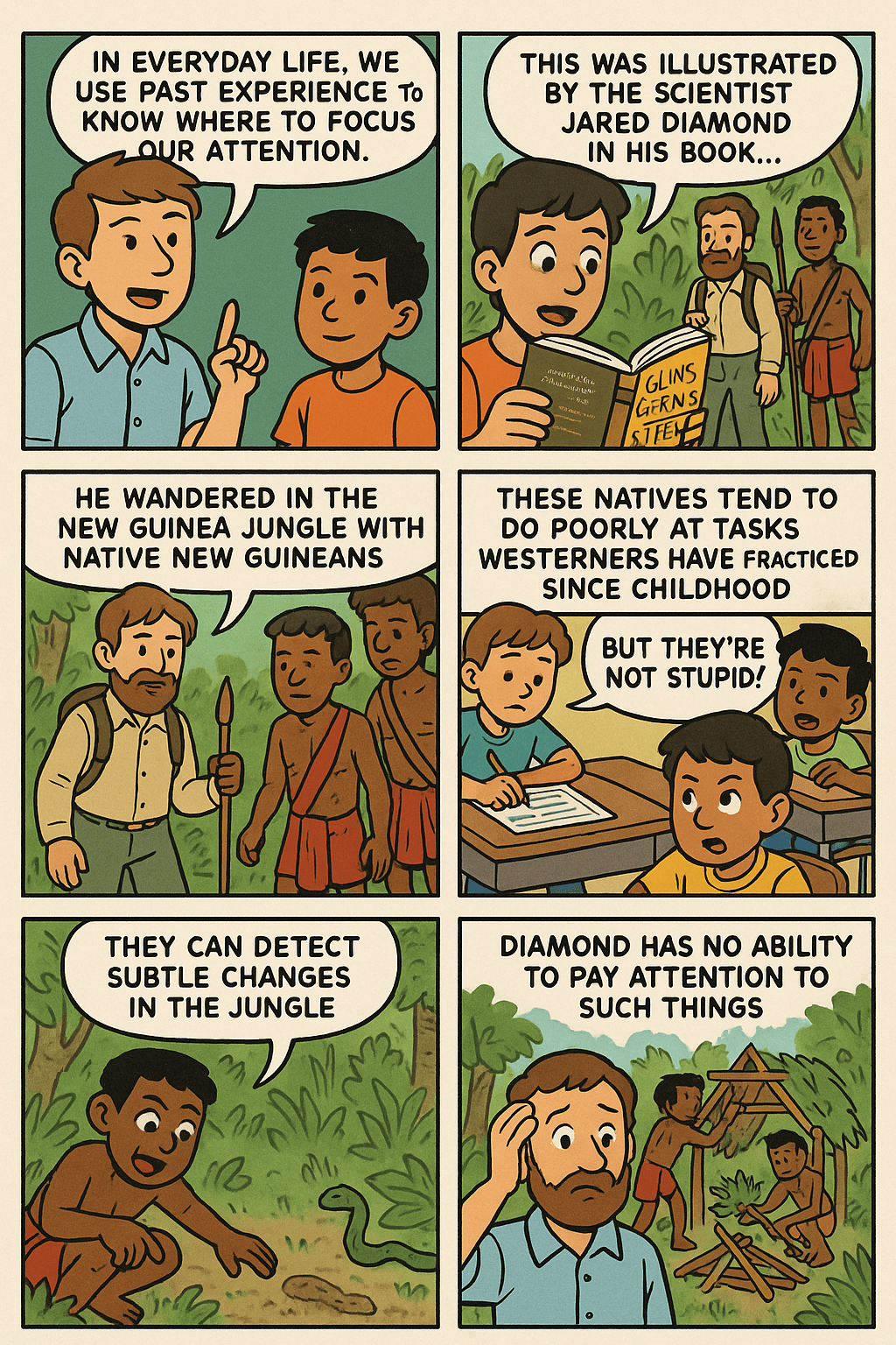 In everyday life, we use previous experience to predict where we should pay attention. Different environments create different expectations. This was profoundly illustrated by the scientist Jared Diamond in his book Guns, Germs, and Steel. He describes an adventure wandering through the New Guinea jungle with native New Guineans. He relates that these natives tend to perform poorly at tasks Westerners have been trained to do since childhood. But they are hardly stupid. They can detect the most subtle changes in the jungle, good for following the tracks of a predator or for finding the way back home. They know which insects to leave alone, know where food exists, can build and tear down shelters with ease. Diamond, who had never spent time in such places, has no ability to pay attention to these things. Were he to be tested on such tasks, he also would perform poorly.