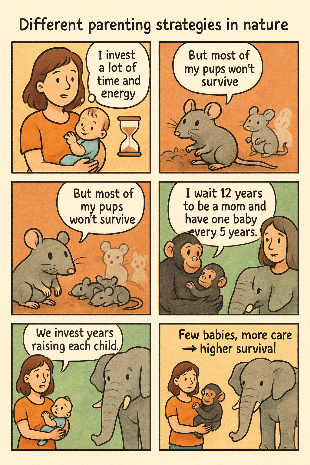 In most respects, humans are one of a relatively small number of species that evolved a very different strategy of investing more energy to reproduce more slowly. Like apes and elephants, we mature at a leisurely pace, grow large bodies, and have few babies but devote much time and energy to raising them well. This unusual strategy succeeds because while apes and elephants produce fewer babies than mice, a larger percentage of their offspring survive to then reproduce. A house mouse can become a mother when she is just five weeks old, has four to ten pups per litter, and can have a new litter every two months over the course of her approximately twelve-month life. However, the vast majority of her pups die young. In contrast, a chimp or elephant mother does not reproduce until she is at least twelve years old, and she gives birth to only one infant every five or six years over the next thirty or so years. About half of these offspring make it to becoming parents.