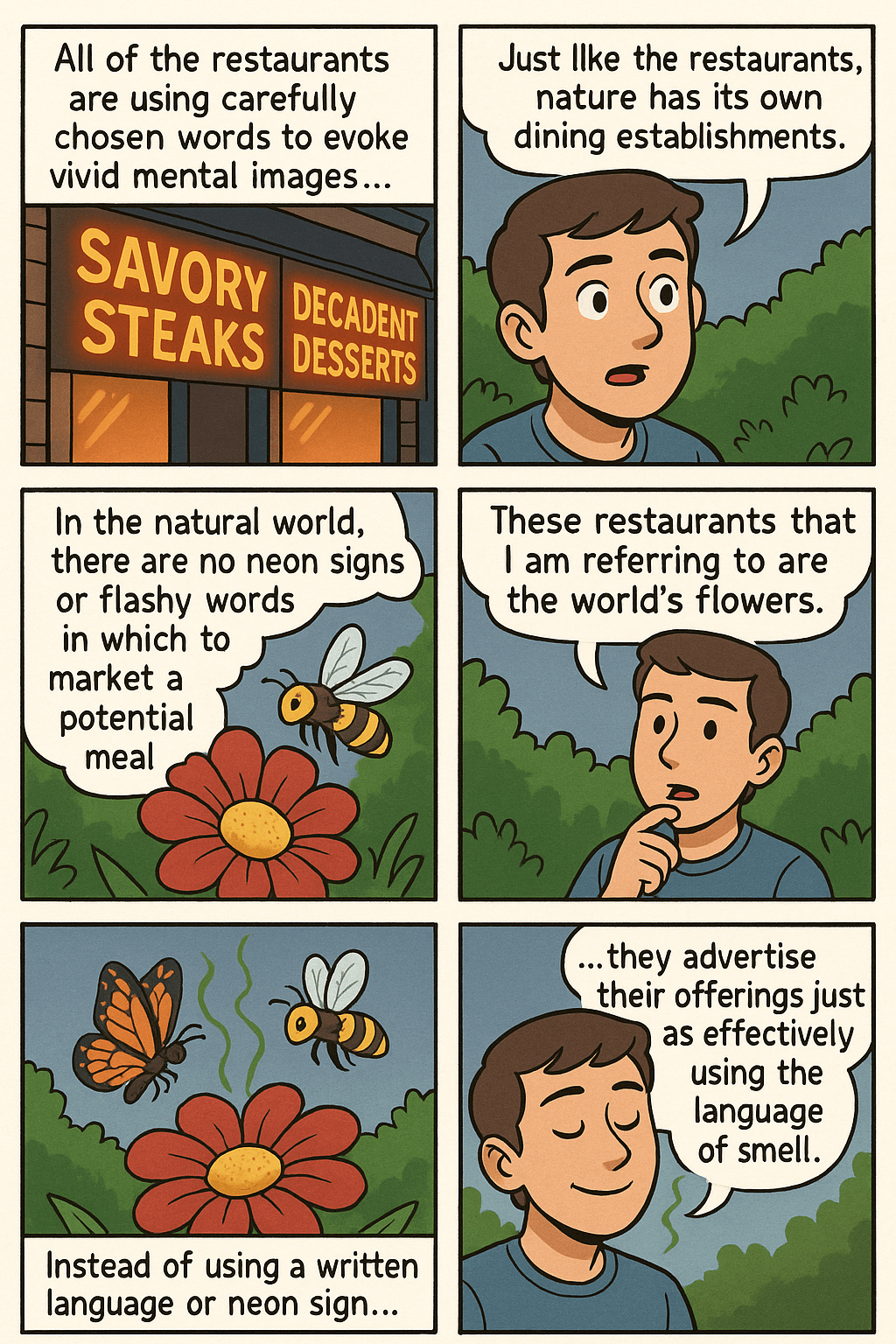 | 3 | In the natural world, there are no neon signs or flashy words in which to market a potential meal to hungry animals. | In the natural world, there are no billboards, neon signs, or flashy words (as we know them) in which to market a potential meal to hungry animals. |
