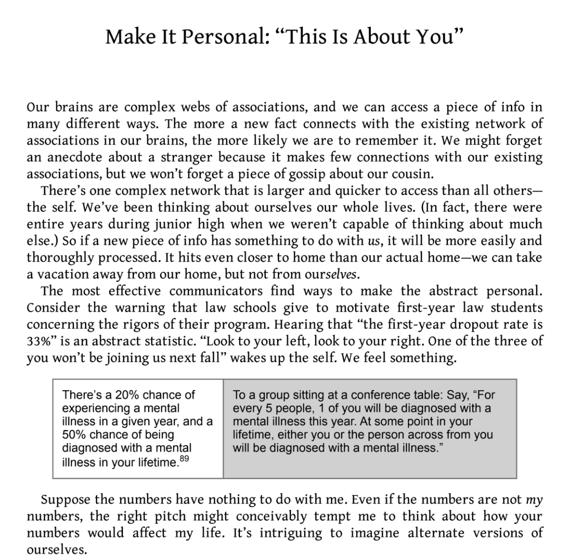 We might forget an anecdote about a stranger because it makes few connections with our existing associations, but we won't forget a piece of gossip about our cousin. There's one complex network that is larger and quicker to access than all others ─ the self. We've been thinking about ourselves in our whole lives. (In fact, there were entire years during junior high when we weren't capable of thinking about much else.) So if a new piece of information has something to do with us, it will be more easily and thoroughly processed. It hits even closer to home than our actual home ─ we can take a vacation away from our home, but not from ourselves. The most effective communicators find ways to make the abstract personal. Consider the warning that law schools give to motivate first-year law students concerning the rigors of their program. Hearing that "the first-year dropout rate is 33%" is an abstract statistic. "Look to your left, look to your right. One of the three of you won't be joining us next fall" wakes up the self.