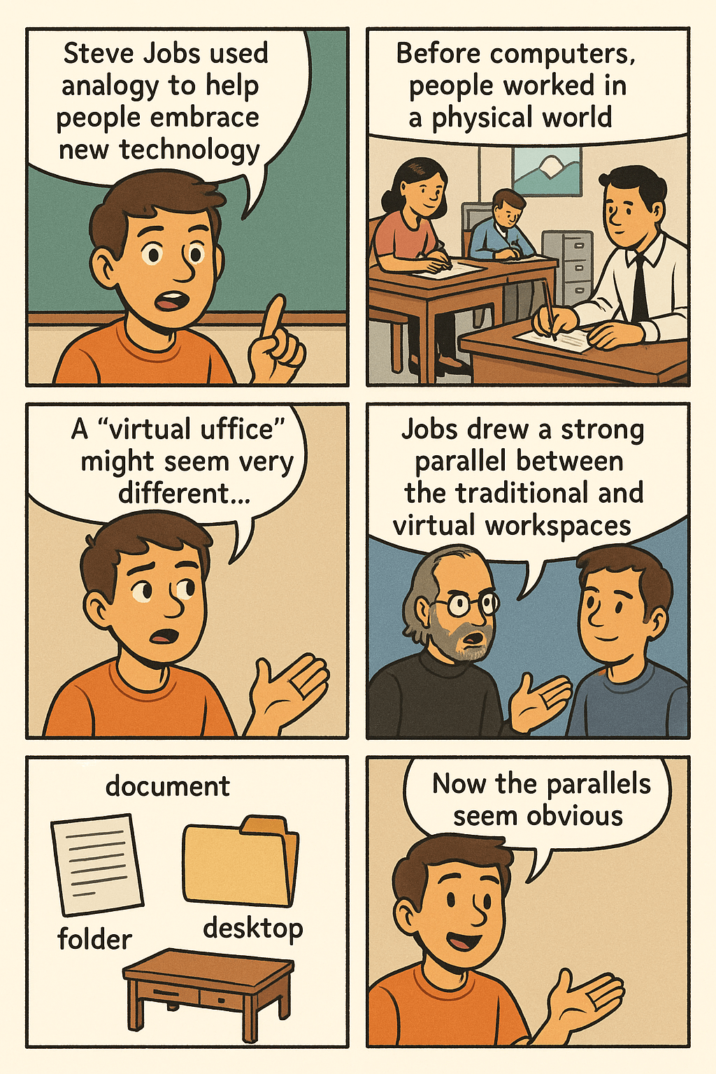 Steve Jobs used analogy to get people to embrace the new technology. Before computers, people worked in a physical world. We used paper and pens and physical file folders and so on. The idea of working in a virtual world was radically different. Or at least seemed radically different. What Jobs understood was that a physical office was fundamentally similar to a virtual office. To win over the masses, Jobs drew strong analogies between the traditional workplace people knew well with the new, unfamiliar virtual workplace. In the pre-computer workplace, when ideas were written on paper it was called . . . a document. When those documents needed to be stored they were put in . . . a folder. And those folders were kept on . . . a desk. Documents, folders, and desktops are the terms we use in our virtual work because Steve Jobs understood that using familiar terms would make the new technology easier to understand. The parallels between the physical and virtual workplace now seem obvious.