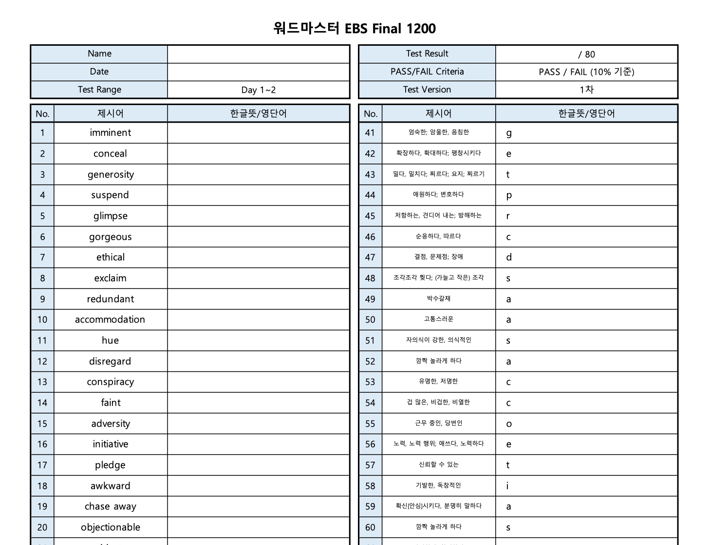 어휘 시험지 및 답지 PDF 공유합니다.
