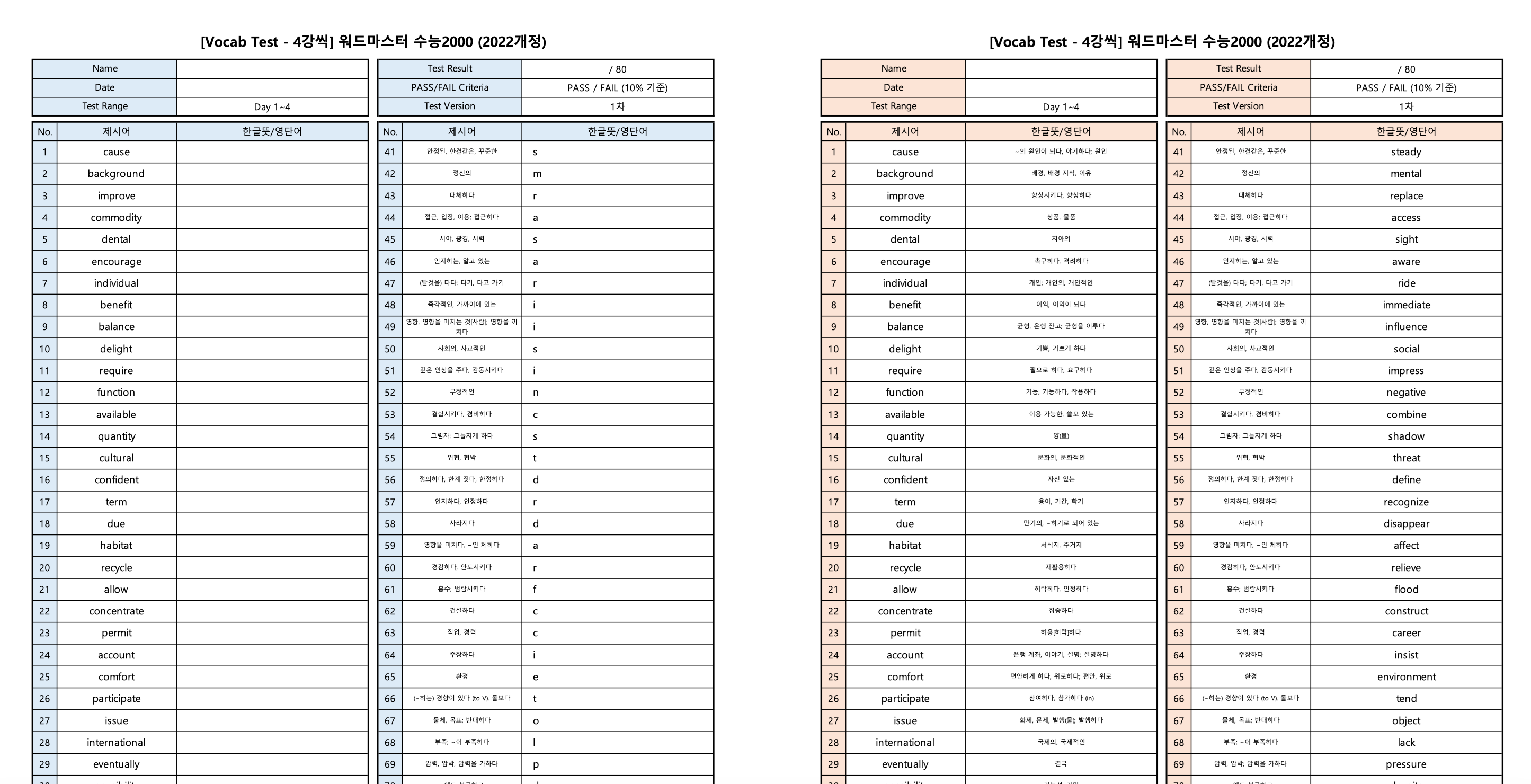 | [무료 PDF] 워드마스터 수능2000 (2022) - 어휘 시험지 및 답지 (1강/2강 묶음) (4) | 2023.11.30 |
