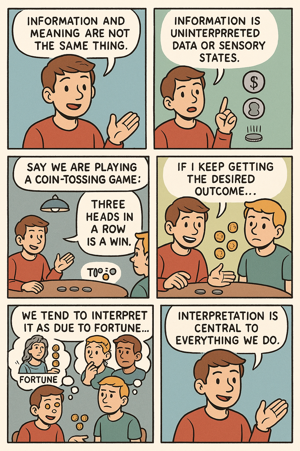 Information and meaning are, clearly, not the same thing. The former refers to uninterpreted data or sensory states whose probability in a certain situation can be easily measured; the latter refers to the interpretation of the data or sensory states, including the special kinds of nuances and values that the information entails, or is intended to have, in the given situation. This applies to any type of information, from alarm signals to sophisticated statements. Take, for instance, a coin-tossing game in which it is decided that throwing three heads in a row constitutes a win. If a certain player ends up consistently with the desired outcome, defeating all who challenge that player, then we tend to interpret the outcome either as the work of Fortune, or else as clever and undetectable cheating on the part of the winning player. Interpretation is at the core of everything we do, think about, and feel.