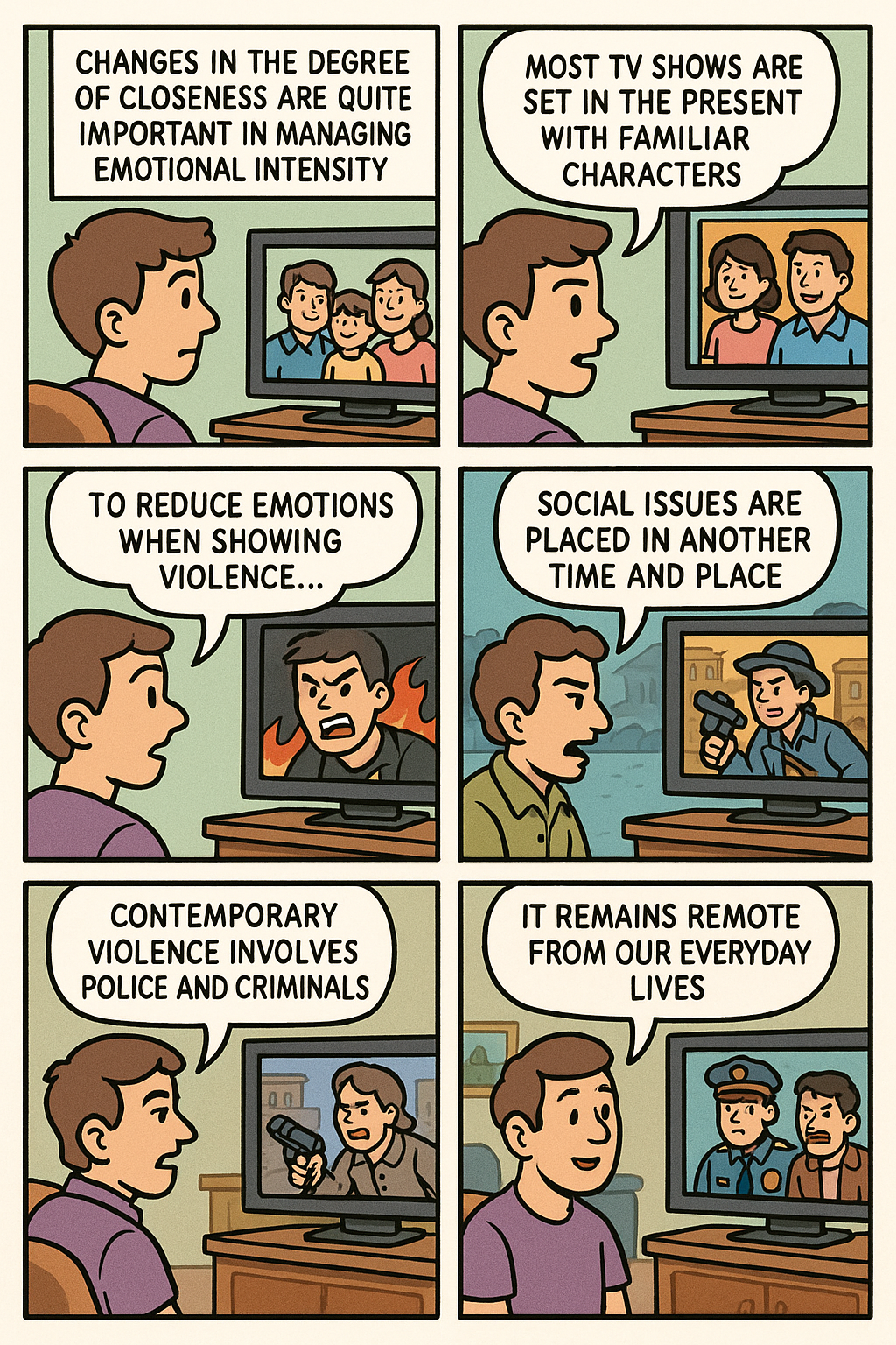 Changes in the degree of closeness are quite important in managing emotional intensity. Take, for example, emotions induced by television. Closeness and familiarity are important in making the fictional environment more real. Accordingly, most TV shows are set in the present or in a time within the memory of the viewers. Most characters are supposed to be types with whom we are familiar. Such closeness and familiarity make it easier for us to perceive the imaginary story to be a real one. In other circumstances, such as when violence is shown on TV, the closeness variable is used to reduce emotional intensity. Television entertainment tends to place social problems involving violence in another time and place, letting us watch those fictionalized characters search for solutions to our problems in settings safely distanced from our own. When violence occurs in a contemporary setting, it is generally the product of the interaction of police and criminals ― again, it is removed from the lives of good citizenry.