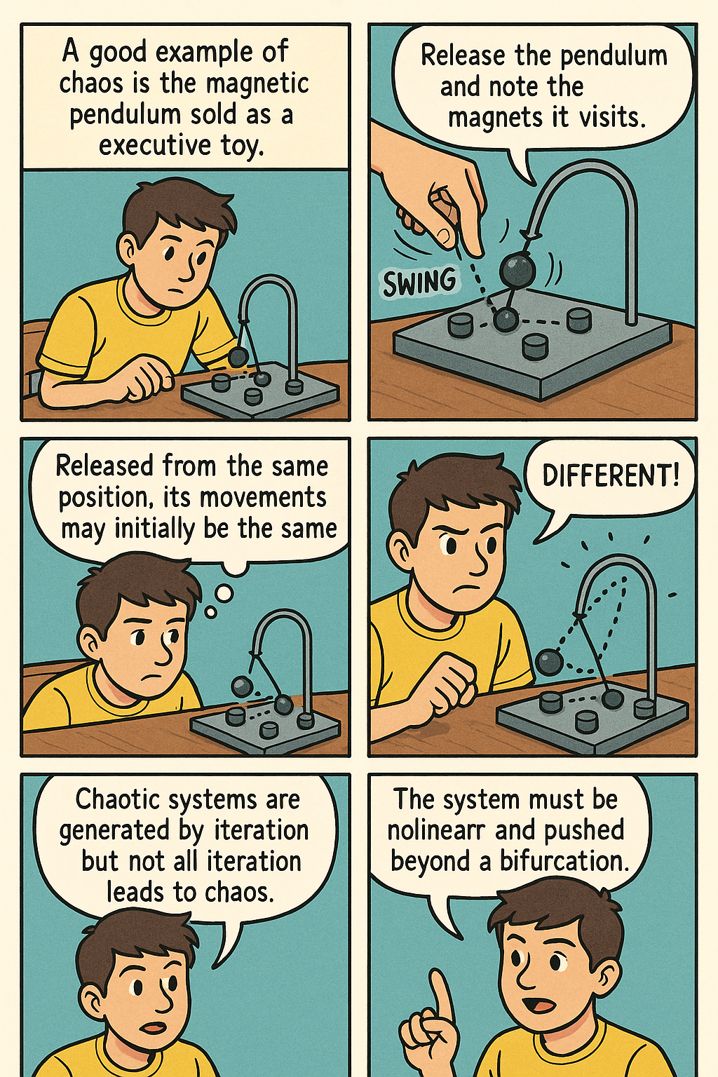 A good example of chaos is the magnetic pendulum sold as an executive toy. It has four magnets arranged in a square at the base and a pendulum that swings back and forth between them. Release the pendulum and note the magnets that it visits, and in what order. If the pendulum is released from the same position a second time, the pattern of movement may at first be the same but soon it will become completely different. In fact, the pattern of its movement is chaotic. No matter how much care is taken to start the pendulum in the same position, it will visit an entirely different set of points on the two occasions. Chaotic systems are generated by iteration, though not all iteration leads to chaos. In order to produce chaos, the iteration has to be within what is called a nonlinear system. Nor are all nonlinear systems chaotic: to become so they need to be pushed beyond a certain point, called a bifurcation. Before that point is reached they may behave in a quite orderly fashion.
